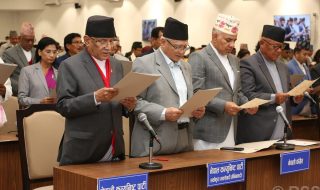 काठमाडौं- प्रतिनिधिसभाका नवनिर्वाचित सांसदहरूले शपथ ग्रहण गरेका छन्। विहीबार सिंहदरबारस्थित नयाँ संसद् भवनमा आयोजित समारोहमा उनीहरूले पद तथा गोपनीयताको शपथ लिएका हुन्। संसद्का ज्येष्ठ सदस्य अर्जुननरसिंह केसीले प्रतिनिधिसभाका २७४ जना सांसदलाई शपथ गराएका हुन् । तीमध्ये ४७...