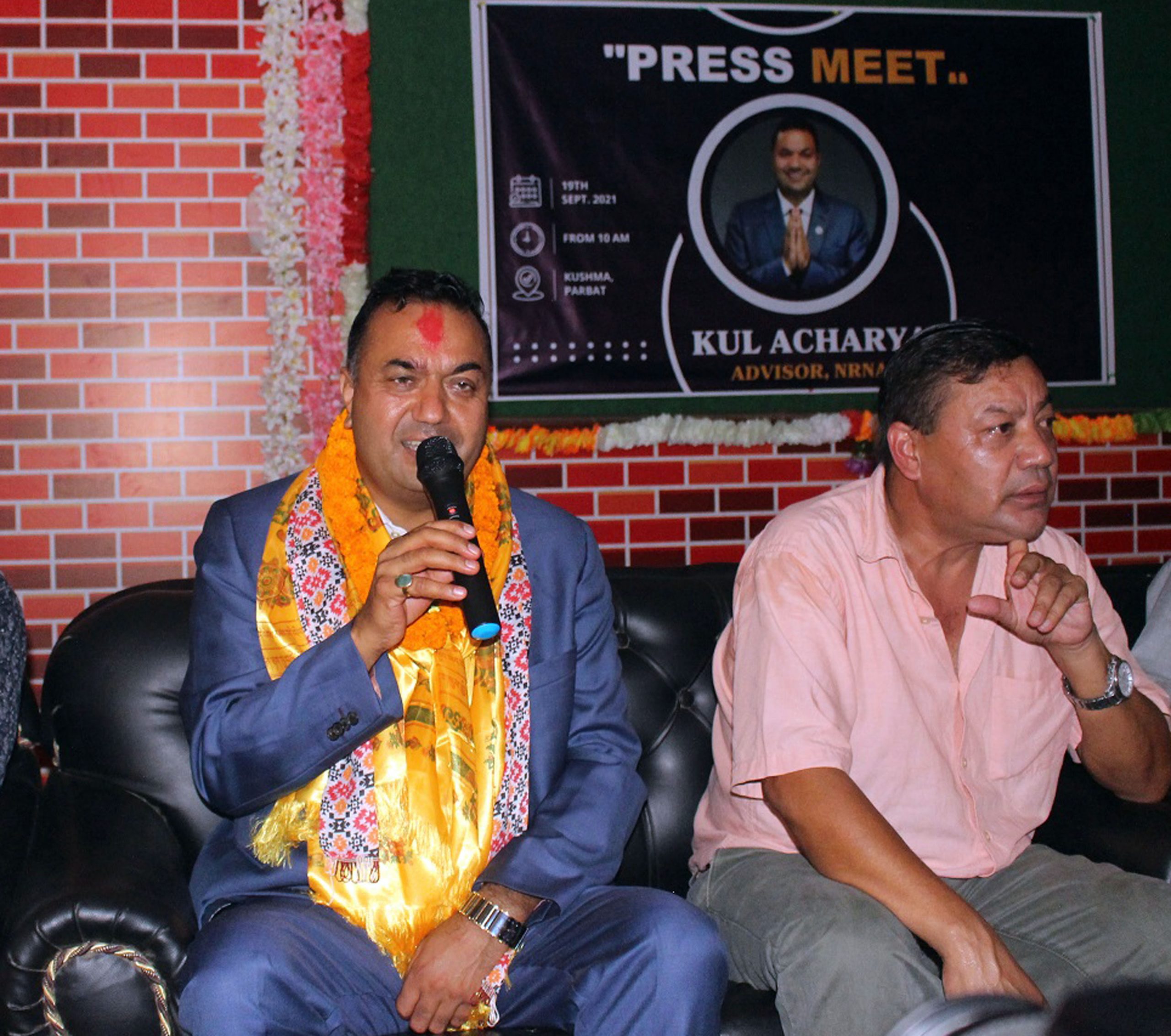 कुश्मा, ३ असोज– गैरआवासीय नेपाली संघ (एनआरएनए) को १०औँ अन्तर्राष्ट्रिय महाधिवेशनमा कुल आचार्यले अध्यक्ष पदमा उम्मेदवारी घोषणा गरेका छन् । सदरमुकाम कुश्मामा पर्वत, बागलुङ र म्याग्दीका पत्रकारको आज सम्मेलन गरी उनले यही असोज २८ देखि ३० गते काठमाडौँमा हुने महाधिवेशनका लागि अध्यक्षको उम्मेदवारी घोषणा गरेका हुन् ।