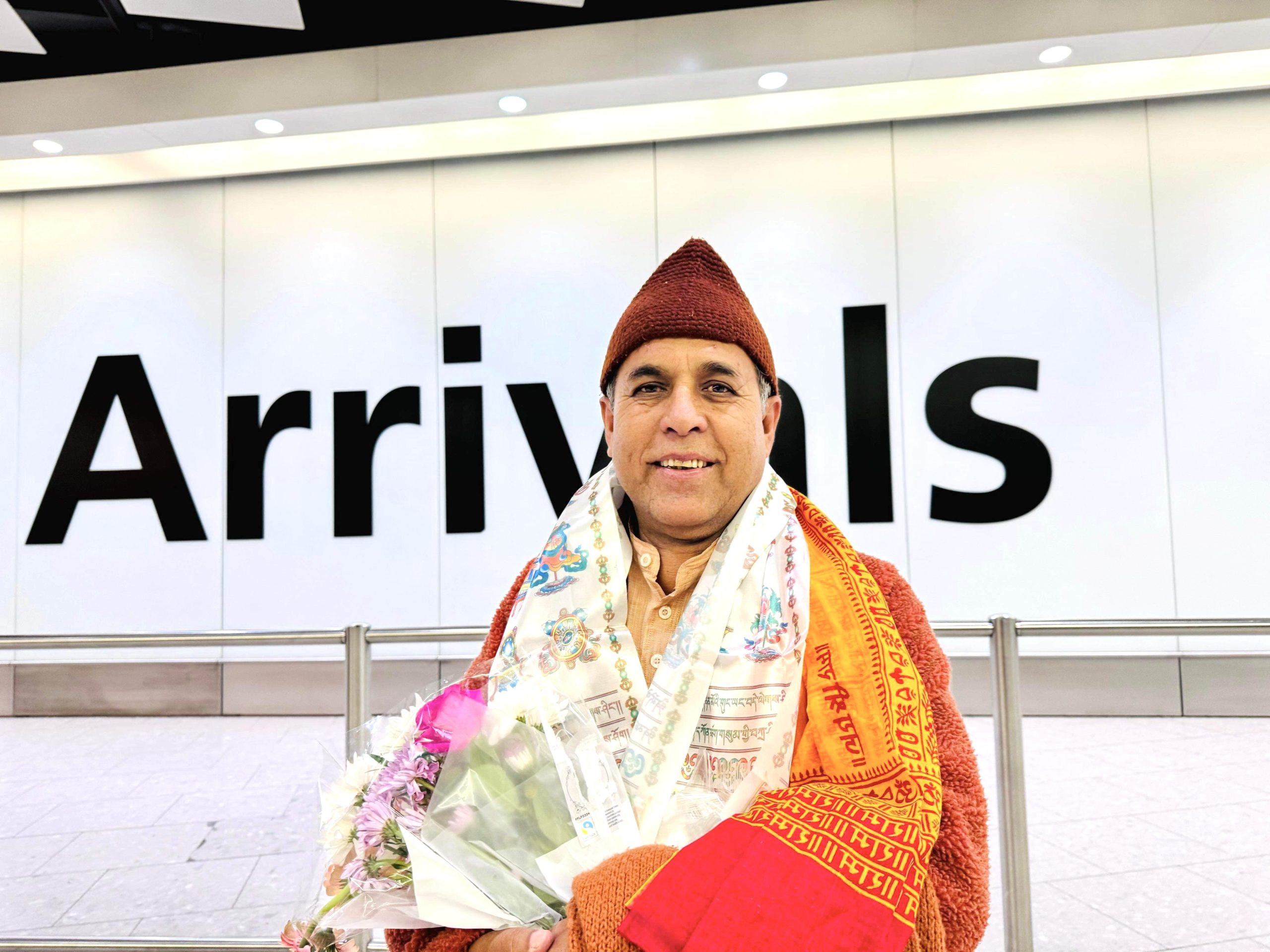 शुक्रबार बिहान उनी लन्डन हिथ्रो विमानस्थल उत्रिएका हुन् । उनलाई पण्डित निलहरि घिमिरे, समाजसेवी ध्रुव केसी लगायत व्यक्तिले विमानस्थलमा स्वागत गरेका थिए ।