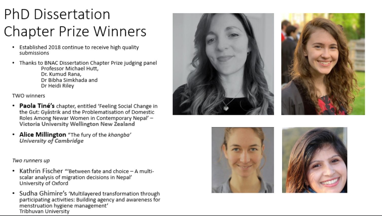 Since 2018, the BNAC has awarded each year a dissertation prize for the best-submitted chapter. This year, amongst the many submissions, there were four outstanding chapters, which made it very hard for the selection committee, including Prof Michael Hutt (SOAS), Dr Kumud Rana (Lancaster), Dr Bidha Sumkhada (Huddersfield) and Dr Heidi Riley (Dublin) to settle on a decision.The first prize went jointly to Alice Millington (Cambridge University) and Paula Tine (Victoria University of Wellington). The panel also named Kathrin Fischer (Oxford University) and Sudha Ghimire (Tribhuvan University) as the joint first runners-up.