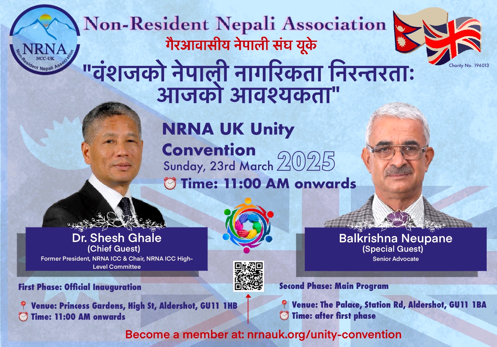एनआरएनएभित्रको सबै मतभेद अन्त्य गरि संघलाई लयमा फर्काउन सम्मानित सर्वोच्च अदालतले २०८० चैत २१ गते एकताको महाधिवेशन गर्न आदेश दिएपछि उच्चस्तरीय समितिले काठमाडौंमा ३ देखि ५ मेमा र यूकेले उच्चस्तरीय समितिकै निर्देशनमा २३ मार्च २०२५ मा बेलायतमा एकता अधिवेशन गर्न लागेको हो ।