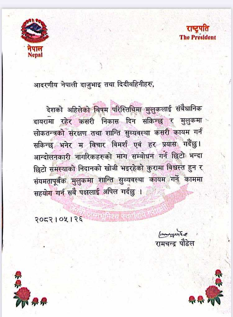 काठमाडौँ, भदौ २६– राष्ट्रपति रामचन्द्र पौडेलले मुलुकलाई संवैधानिक दायरामा रहेर कसरी निकास दिन सकिन्छ र मुलुकमा लोकतन्त्रको संरक्षण तथा शान्ति सुव्यवस्था कसरी कायम राख्न सकिन्छ भनेर विचार विमर्श एवं हर प्रयासमा रहेको बताएका छन् ।