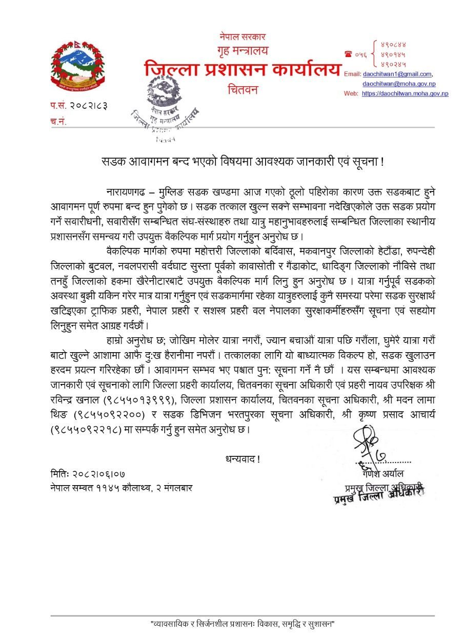 आज एक विज्ञप्ति जारी गरी चितवन प्रशासनले यात्रा अघि सडकको अवस्था बुझेर मात्र यात्रा गर्न र सकभर यात्रामा ननिस्कन आग्रह गरेको हो।