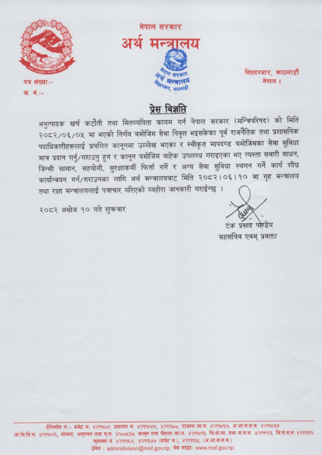 अर्थ मन्त्रालयका प्रवक्ता टंकप्रसाद पाण्डेयले जारी गरेको सूचनामा उल्लेख छ, ‘अनुत्पादक खर्च कटौती तथा मितव्ययिता कायम गर्न नेपाल सरकार (मन्त्रिपरिषद्) को मिति २०८२/०६/०५ मा भएको निर्णयबमोजिम सेवा निवृत्त भइसकेका पूर्वराजनैतिक तथा प्रशासनिक पदाधिकारीहरूलाई प्रचलित कानूनमा उल्लेख भएका र स्वीकृत मापदण्ड बमोजिमका सेवा सुविधा मात्र प्रदान गर्नु/गराउनु हुन र कानून बमोजिम बाहेक उपलब्ध गराइएका भए त्यस्ता सवारी साधन, जिन्सी सामान, सहयोगी, सुरक्षाकर्मी फिर्ता गर्ने र अन्य सेवा सुविधा स्थगन गर्ने कार्य शीघ्र कार्यान्वयन गर्न/गराउनका लागि अर्थ मन्त्रालयबाट मिति २०८२।०६।१० मा गृह मन्त्रालय तथा रक्षा मन्त्रालयलाई पत्राचार गरिएको व्यहोरा जानकारी गराइन्छ।’