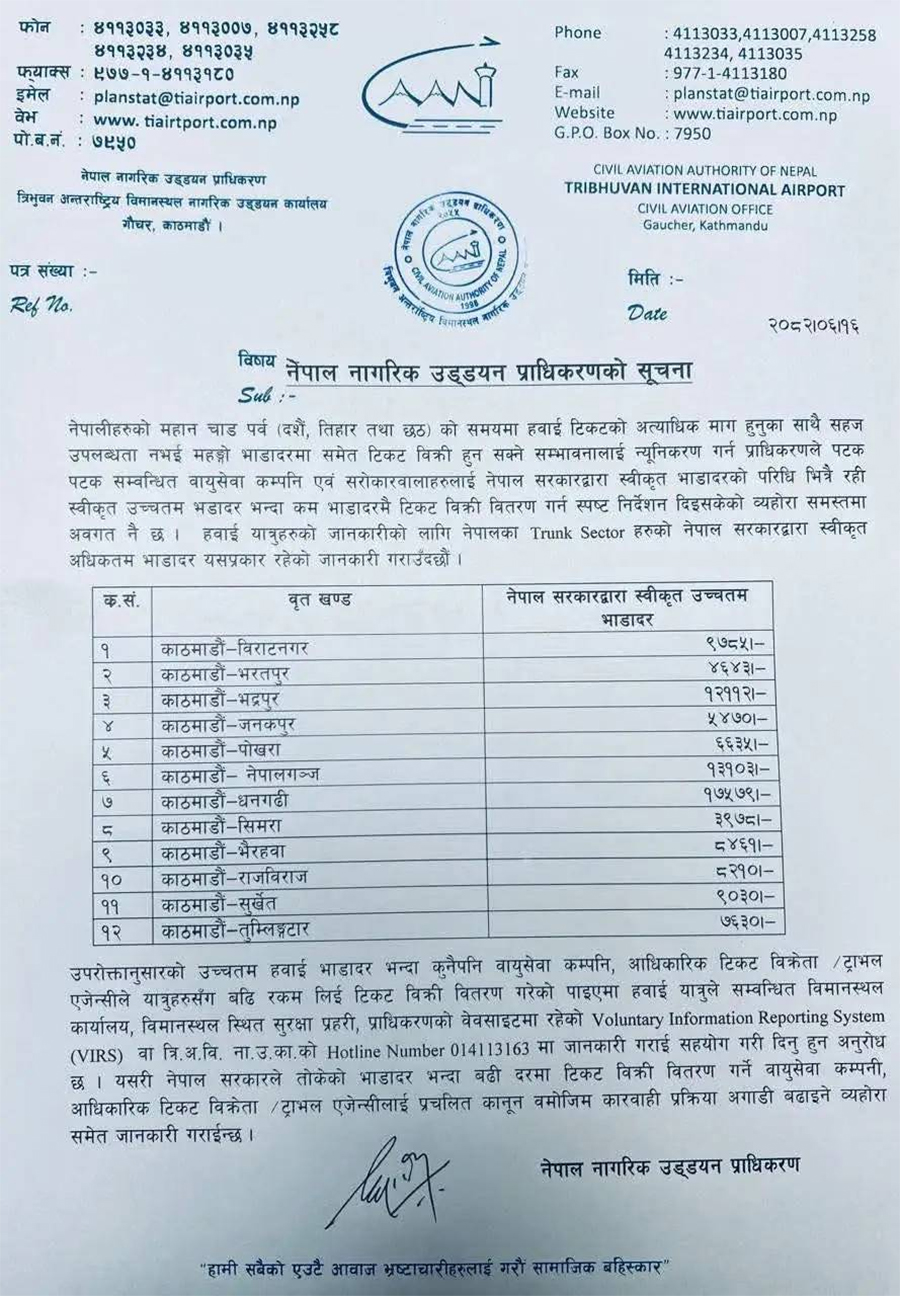 यो उच्चतम हवाई भाडादर भएकाले यसभन्दा बढी मूल्य नलिन प्राधिकरणले वायुसेवा कम्पनी, टिकट बिक्रेताहरूलाई अनुरोध पनि गरेको छ।
