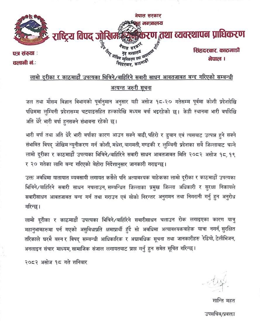 प्राधिकरणले भारी वर्षा तथा अति धेरै भारी वर्षाका कारण आउन सक्ने बाढी, पहिरो र डुबान एवं त्यसबाट उत्पन्न हुने सक्ने सम्भावित विपद् जोखिम न्यूनीकरण गर्न कोशी, मधेश, बागमती, गण्डकी र लुम्बिनी प्रदेशका सबै जिल्लाबाट चल्ने लामो दूरीका र काठमाडौँ उपत्यका भित्रिने र बाहिरिने सवारी साधन आवतजावत आज असोज १८ देखि २० गतेसम्मका लागि बन्द गरिएको जनाएको छ ।