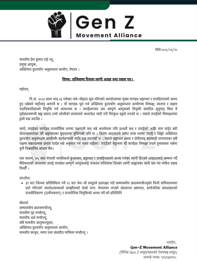काठमाडौं । विभिन्न जेनजी समूह र व्यक्तिहरूको सहभागितामा गठन गरिएको ‘जेनजी मुभमेन्ट अलायन्स’ले अख्तियार दुरुपयोग अनुसन्धान आयोगका प्रमुख आयुक्त प्रेमकुमार राईसहित सम्पूर्ण आयुक्तहरूलाई तत्काल स्वेच्छिक राजीनामा दिन आग्रह गरेको छ।