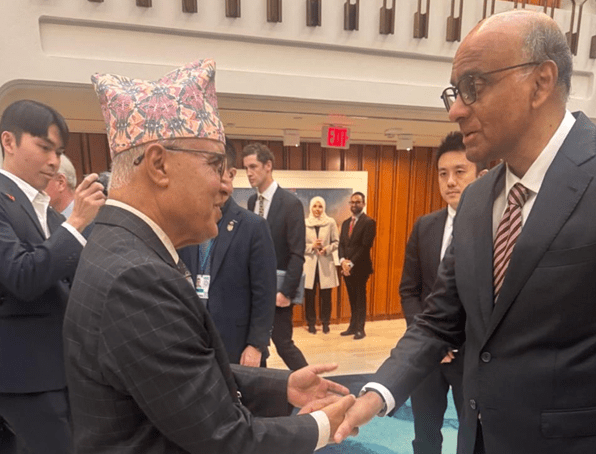 वासिङ्टन डीसी– अर्थमन्त्री रामेश्वरप्रसाद खनालले सिङ्गापुरका राष्ट्रपति थरमन शानमुगार्थमसँग भेटवार्ता गरेका छन् । विश्व बैंक समूहको वार्षिक बैठकमा भाग लिन अमेरिका आएका खनालले ‘साइडलाइन’ बैठकमा राष्ट्रपति थरमनसँग भेट गरेका हुन्।