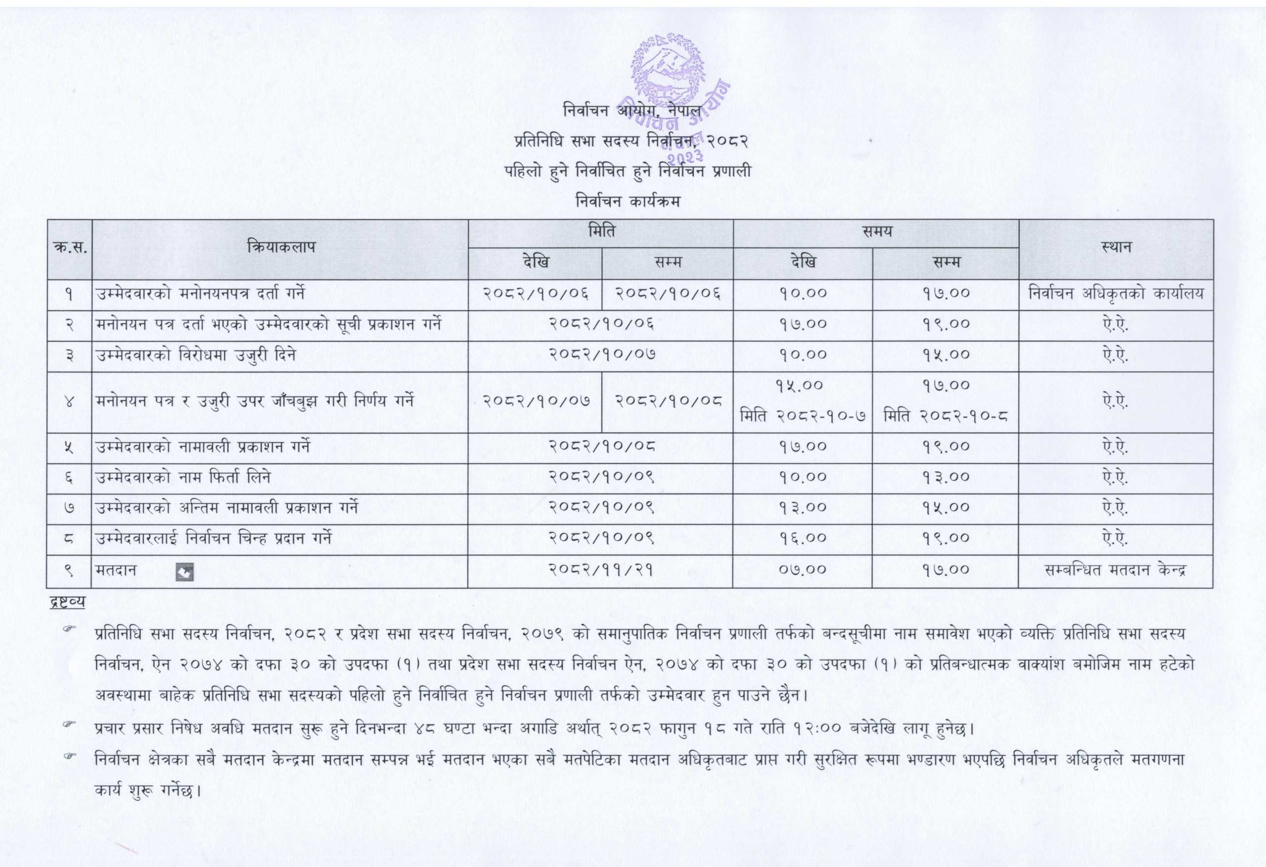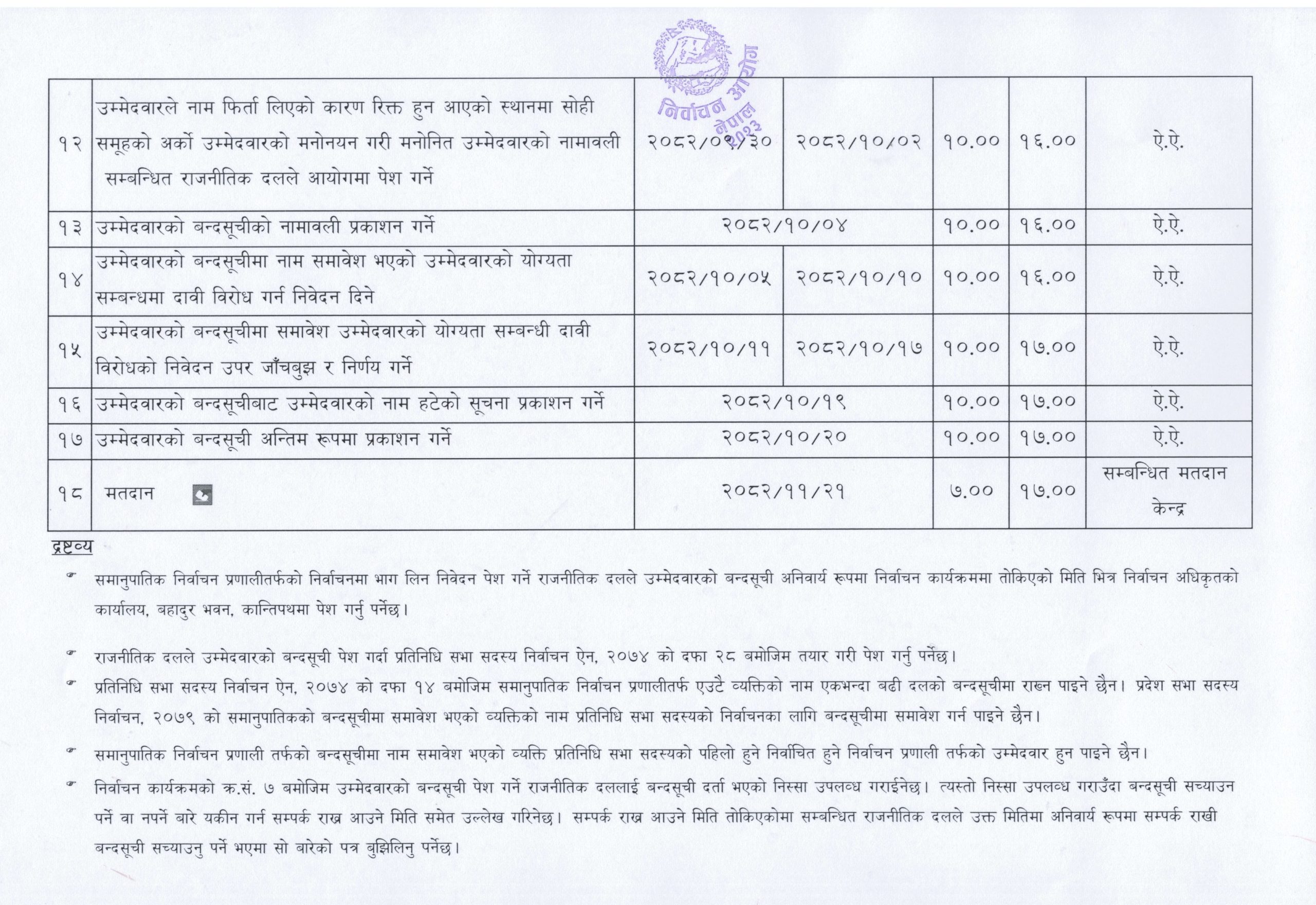 माघ २० गते बिहान १० बजेदेखि बेलुकी ५ बजेसम्म उम्मेदवारको बन्दसूची अन्तिम रूपमा प्रकाशन गरिने आयोगले जनाएको छ। आयोगले स्वीकृत गरेको निर्वाचन कार्यक्रमअनुसार फागुन २१ गते बिहान ७ बजेदेखि बेलुका ५ बजेसम्म सम्बन्धित मतदान केन्द्रमा मतदान हुनेछ।