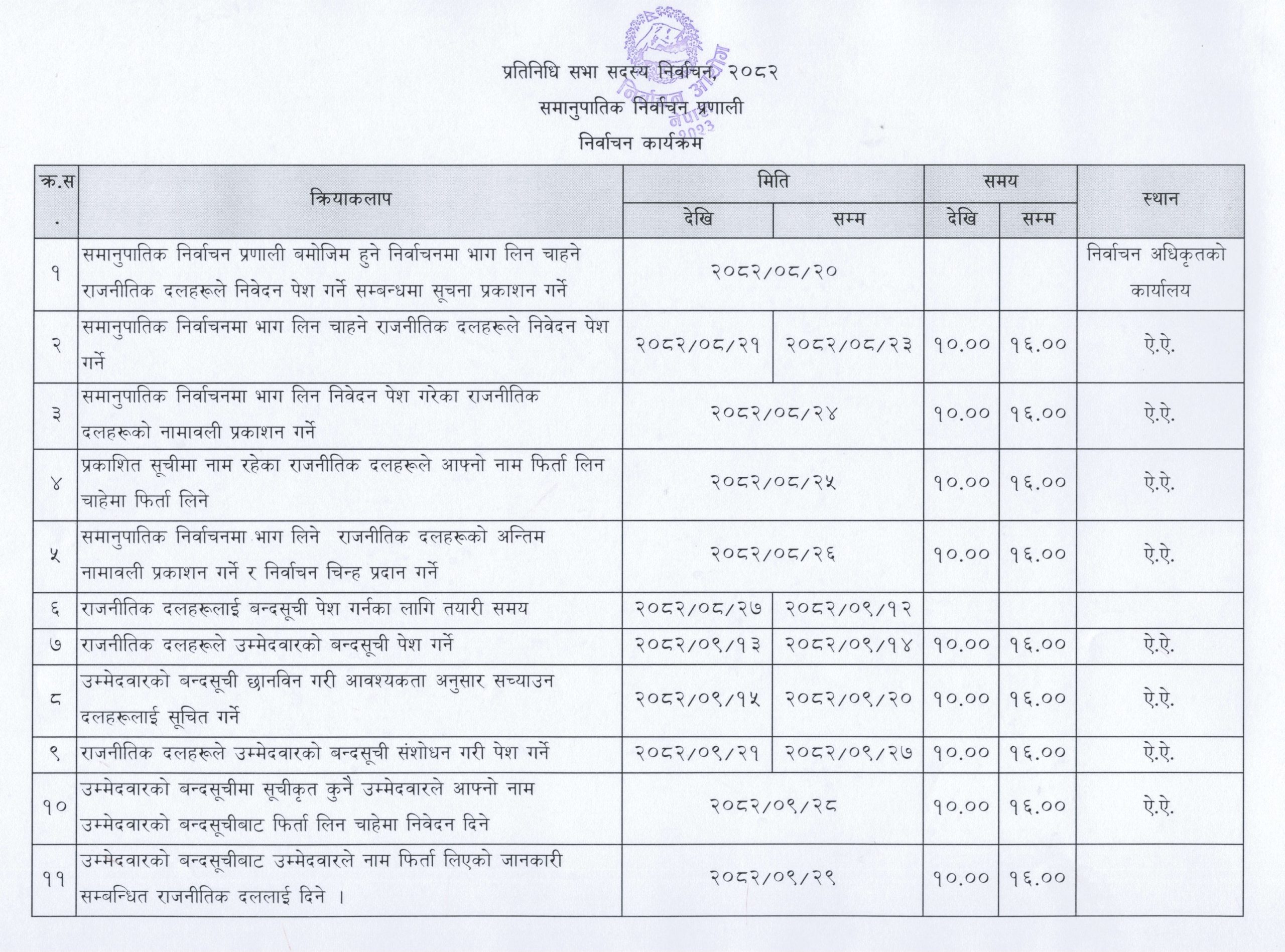 समानुपातिक निर्वाचन प्रणालीतर्फको निर्वाचन कार्यक्रम मंसिर २० गतेदेखि सञ्चालन हुनेछ। यसअन्तर्गत, मंसिर २१ गते बिहान १० बजेदेखि २३ गते दिउँसो ४ बजेसम्म समानुपातिक निर्वाचनमा भाग लिन चाहने राजनीतिक दलहरूले निवेदन पेस गर्नुपर्नेछ।