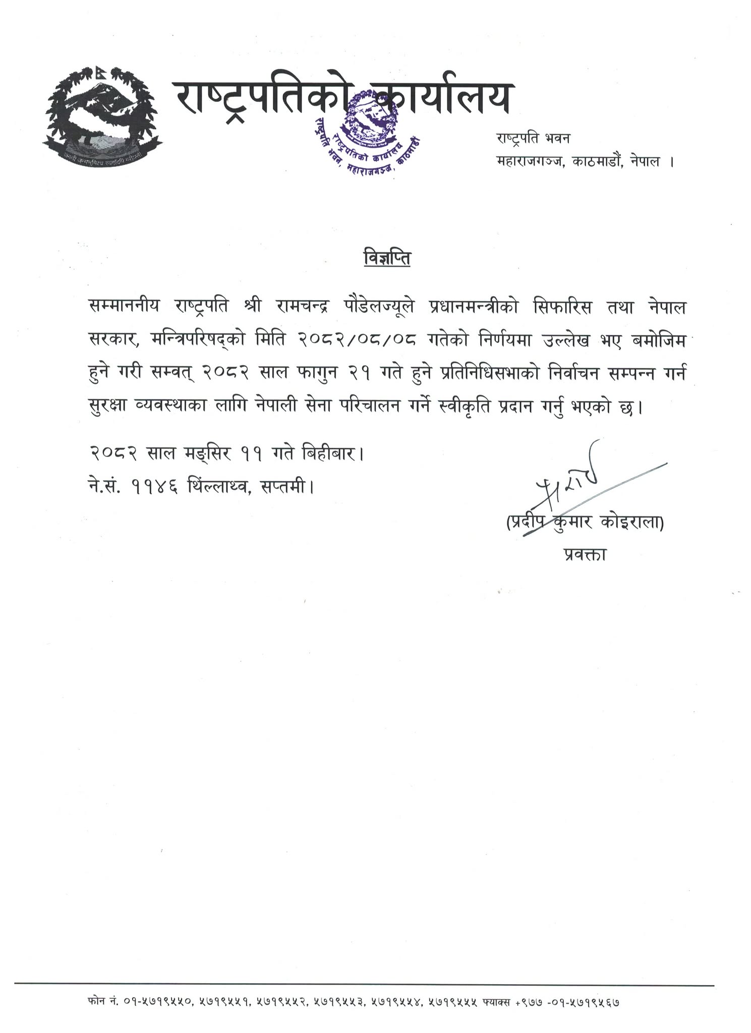 राष्ट्रपति कार्यालयका प्रवक्ता प्रदीपकुमार कोइरालाद्वारा आज जारी विज्ञप्तिमा निर्वाचन सुरक्षालाई सुदृढ बनाउन सरकारले गरेको सिफारिसअनुसार राष्ट्रपति पौडेलले सेना परिचालनका लागि अनुमोदन गरेको उल्लेख गरिएको छ।