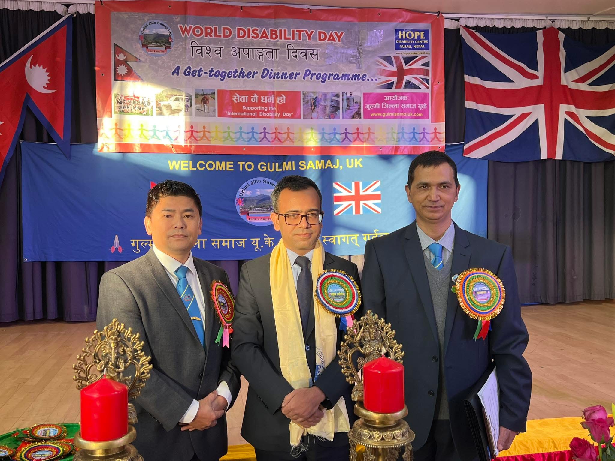 समाजका अध्यक्ष रुद्र थापाको अध्यक्षतामा सम्पन्न कार्यक्रममा प्रमुख अतिथि बेलायतका लागि नेपाली कार्यवाहक राजदूत विपिन दुवाडीले गुल्मी जिल्ला समाजले अपांगता दिवसको अवसरमा वर्षेनी गर्दै आएको च्यारिटी कार्यक्रमबाट आफू प्रभावित भएको बताए ।