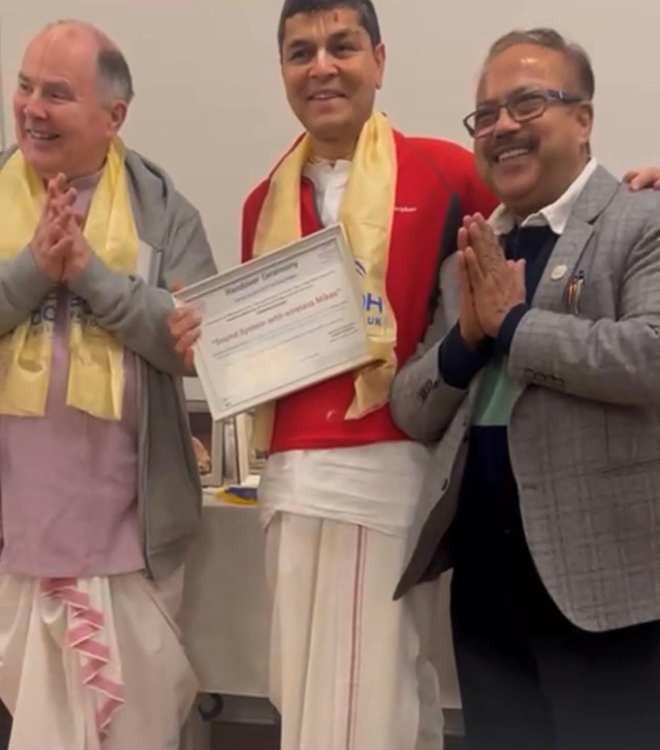 The sound system, valued at £1,021.45, is expected to play an important role in promoting spiritual life and Krishna consciousness within the local community. It will support programmes such as bhajans, kirtans, lectures, and community gatherings.