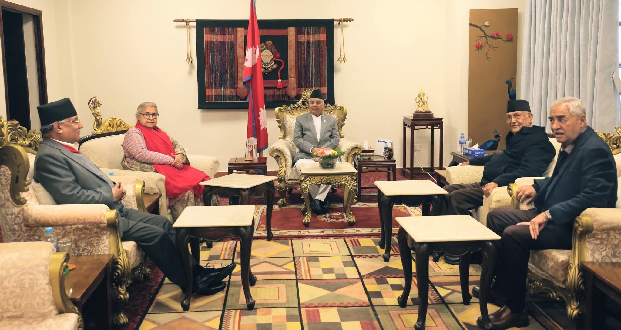 राष्ट्रपतिको समन्वयमा प्रधानमन्त्री र तीन दलका प्रमुख नेताहरूको भेट। फाइल तस्बिर