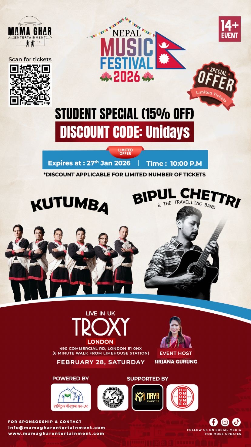 लन्डन– नेपाली संगीतका दुई लोकप्रिय र चर्चित ब्याण्ड तथा गायकको प्रस्तुतिमा बेलायतमा पहिलोपटक ‘नेपाल म्यूजिक फेस्टिभल २०२६’ हुँदैछ।