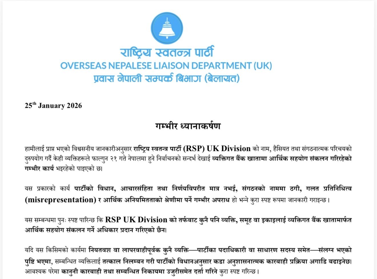 लन्डन । राष्ट्रिय स्वतन्त्र पार्टी (रास्वपा) निकट प्रवास नेपाली सम्पर्क विभाग बेलायतले आफ्नो संगठनको नाम, हैसियत तथा संगठनात्मक परिचयको दुरुपयोग गर्दै केही व्यक्तिले चुनावको सन्दर्भ देखाइ व्यक्तिगत बैंक खातामा आर्थिक सहयोग संकलन गरिरहेको पाइएको भन्दै कानूनी कारवाही गर्ने चेतावनी दिएको छ ।