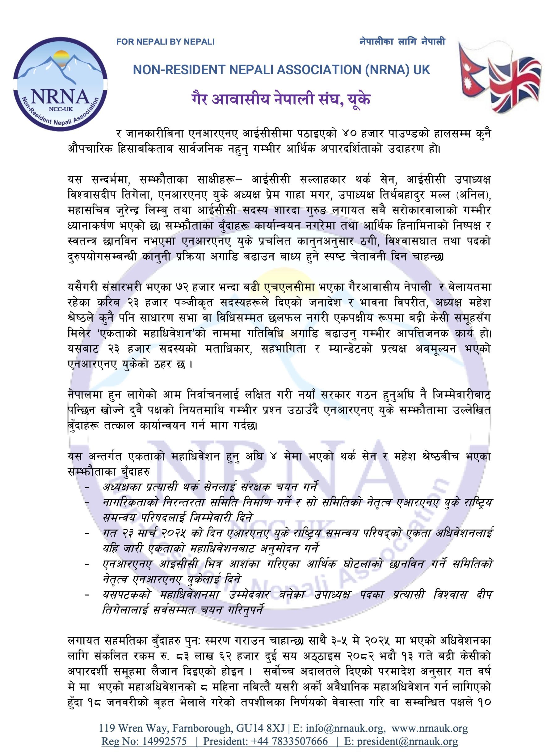 साथै, सर्वोच्च अदालतले दिएको परमादेशको मर्मविपरीत बद्री केसी समूहसँग मिलेर गरिएको एकपक्षीय निर्णयले बेलायतका २३ हजार पञ्जीकृत सदस्यहरूको भावना र लोकतान्त्रिक प्रक्रियालाई बेवास्ता गरेको र यसले संस्थाको छविमा गम्भीर क्षति पुर्याएको एनआरएनए यूकेको ठहर छ।