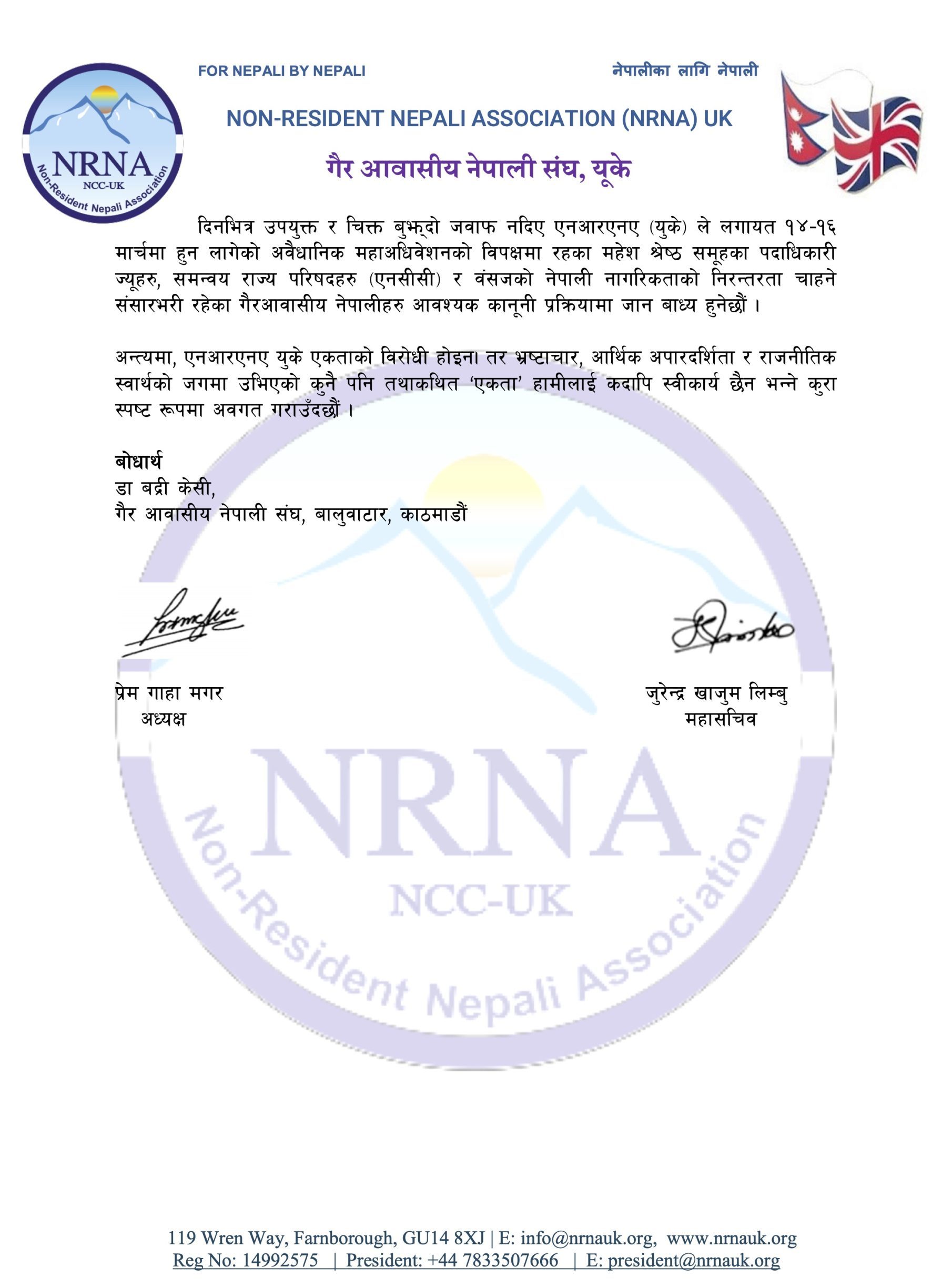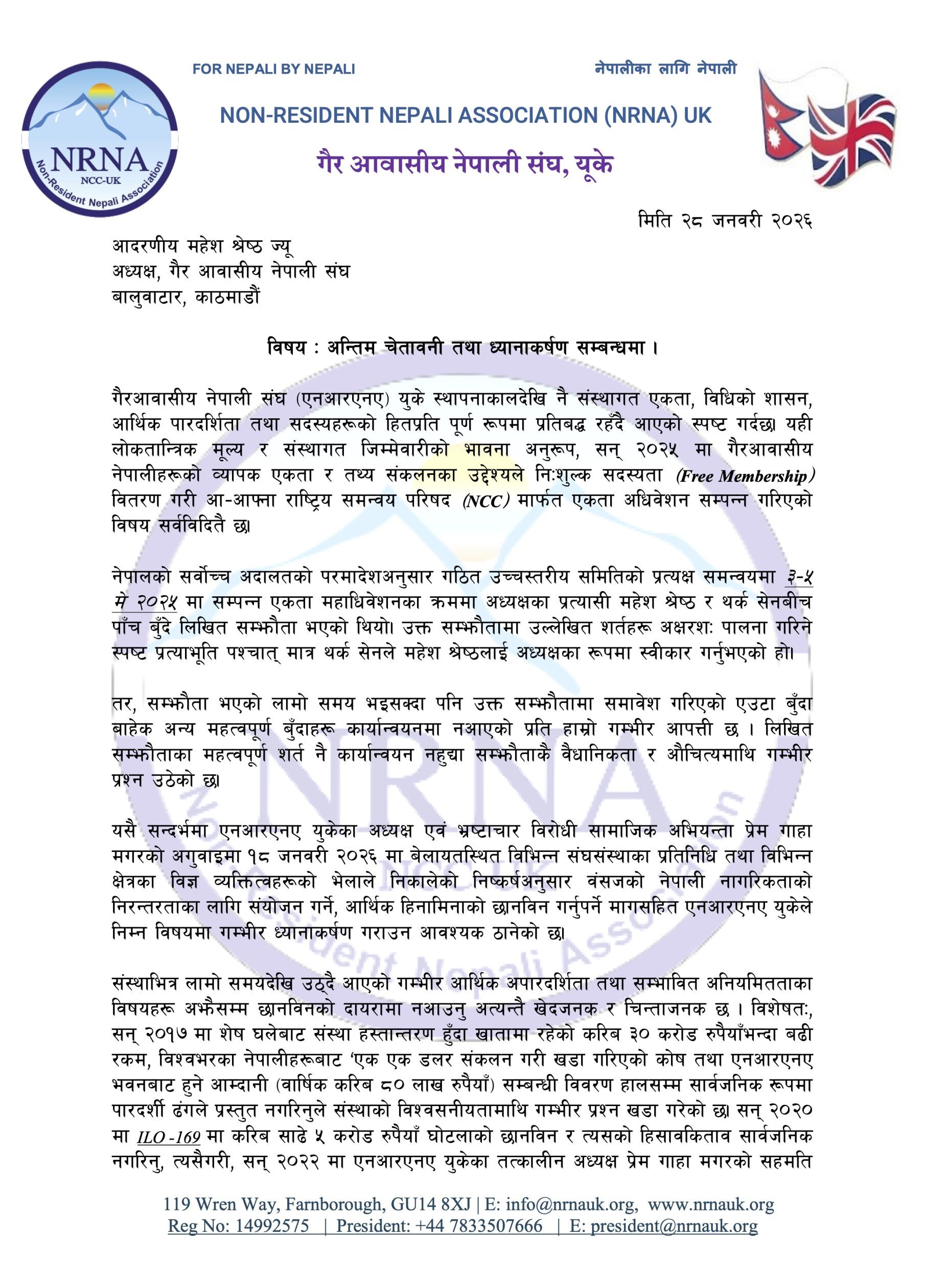 अध्यक्ष महेश श्रेष्ठलाई इमेलमार्फत आधिकारिक पत्र पठाउँदै एनआरएनए यूकेले खबरदारी गरेको हो।