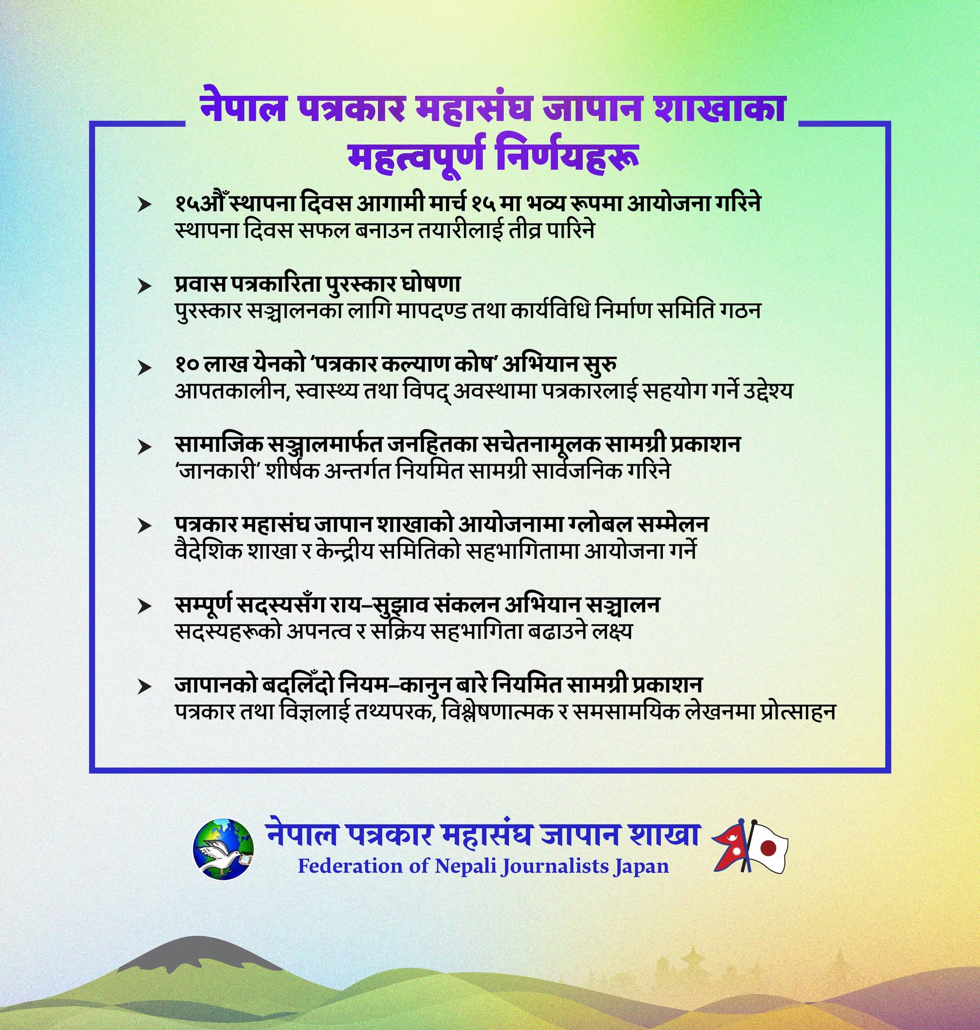 स्थापना दिवसलाई विशेष बनाउँदै महासंघले प्रवासमा सक्रिय नेपाली पत्रकारहरूको योगदानको कदर गर्न प्रवास पत्रकारिता पुरस्कार स्थापना गर्ने तथा १० लाख येनको पत्रकार कल्याण कोष सञ्चालनमा ल्याउने महत्वपूर्ण निर्णयहरू गरेको छ।