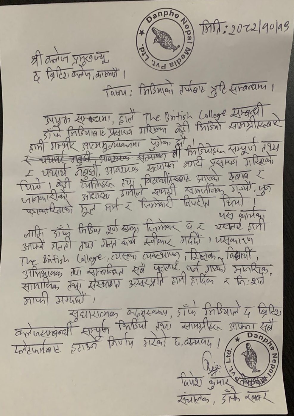 डाँफे नेपाल मिडियाका सञ्चालक दिपेश कुमार जैसवालले द ब्रिटिश कलेजलाई पत्र पठाउँदै आफूहरूबाट भएको गल्ती स्वीकार गरेका हुन् । सूचना तथा प्रसारण विभागमा दर्ता नं. ४५२४–२०८०–२०८१ तथा प्रेस काउन्सिल नेपालमा सूचीकृत दर्ता नं. ४५०६ अन्तर्गत दर्ता भएको डाँफे नेपाल मिडिया प्रा.लि.ले सत्यतथ्य जाँच नगरी सामग्री प्रशारण गरिएको स्वीकार गरेको छ ।