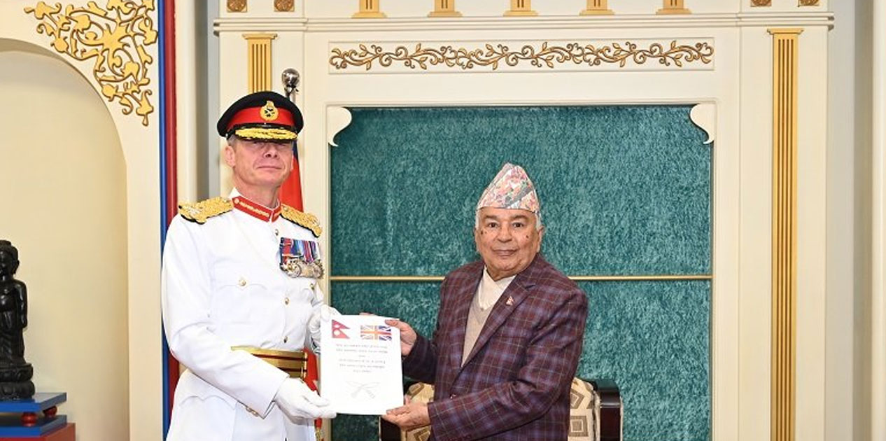 काठमाडौँ। राष्ट्रपति रामचन्द्र पौडेलसमक्ष संयुक्त अधिराज्य बेलायती सेनाका मेजर जेनरल जेरल्ड एम स्ट्रिकलेण्डसहितको टोलीले गोर्खा ब्रिगेडको वार्षिक प्रतिवेदन प्रस्तुत गरेको छ ।
