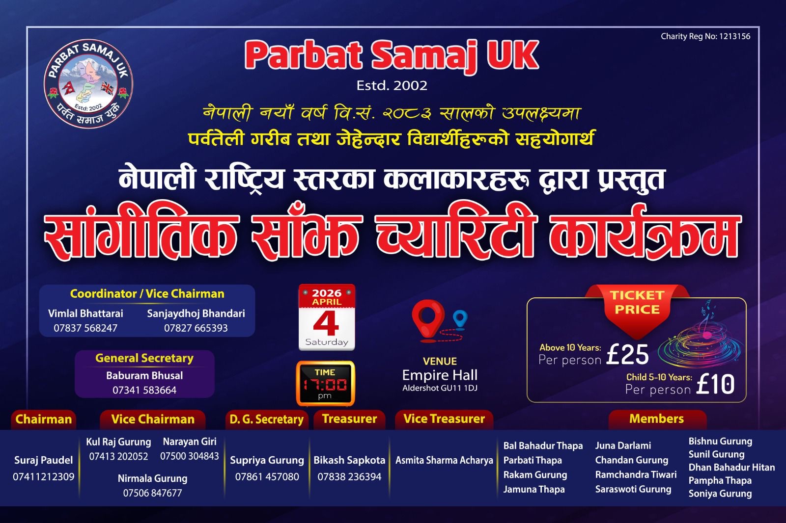 कार्यक्रम संयोजन उपाध्यक्षद्धय सन्जयध्वज भण्डारी र भिमलाल भट्टराईले गर्दैछन् । टिकट मूल्य वयस्कहरुका लागि २५ पाउण्डमात्र तोकिएको छ भने ५ देखि १० वर्षसम्मका बालबालिकालाई जनही १० पाउण्ड छ ।
