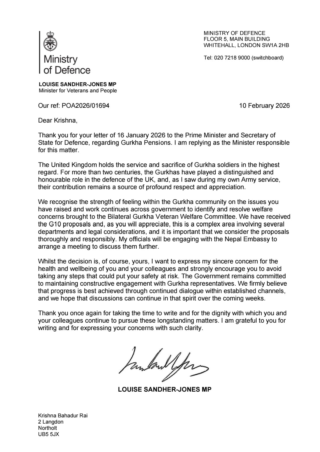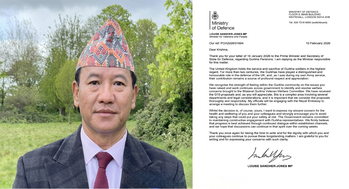 ब्रिटिश गोर्खा संयुक्त संघर्ष समिति यूके-नेपालका तर्फबाट बेलायती प्रधानमन्त्री किअर स्टारमर तथा रक्षा मन्त्रालय अन्तर्गत भेट्रान्स मन्त्री लुइस स्यान्डर–जोन्सलाई पठाइएको एक अल्टिमेटम पत्रको जवाफ दिंदै जोन्सले उक्त जानकारी दिएकी हुन् ।