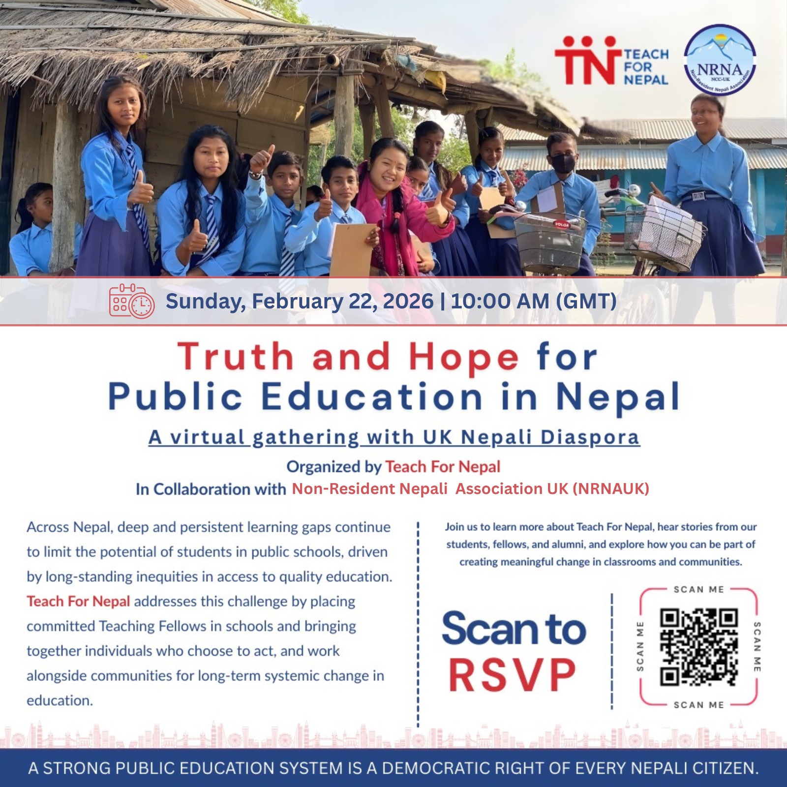 लन्डन – गैर आवासीय नेपाली संघ (एनआरएनए) युके तथा टिच फर नेपालको सहकार्यमा आइतबार, २२ फेब्रुअरी बिहान १० बजे नेपालमा सार्वजनिक शिक्षाको अवस्थाबारे एक वेबिनार आयोजना गर्न लागिएको छ।