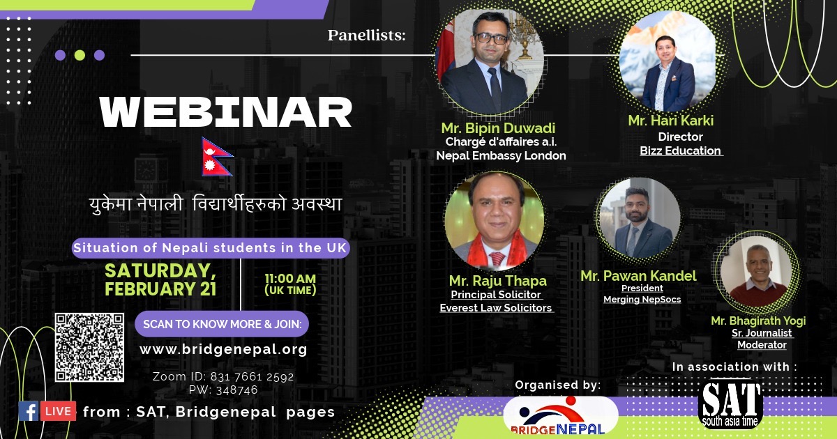 लन्डन – युकेमा स्थापना गरिएको संस्था ब्रिज नेपालले बेलायतमा अध्ययनरत नेपाली विद्यार्थीहरुले भोग्नु परिरहेका समस्याबारे छलफल गर्न एक वेबिनार आयोजना गर्न लागेको छ।