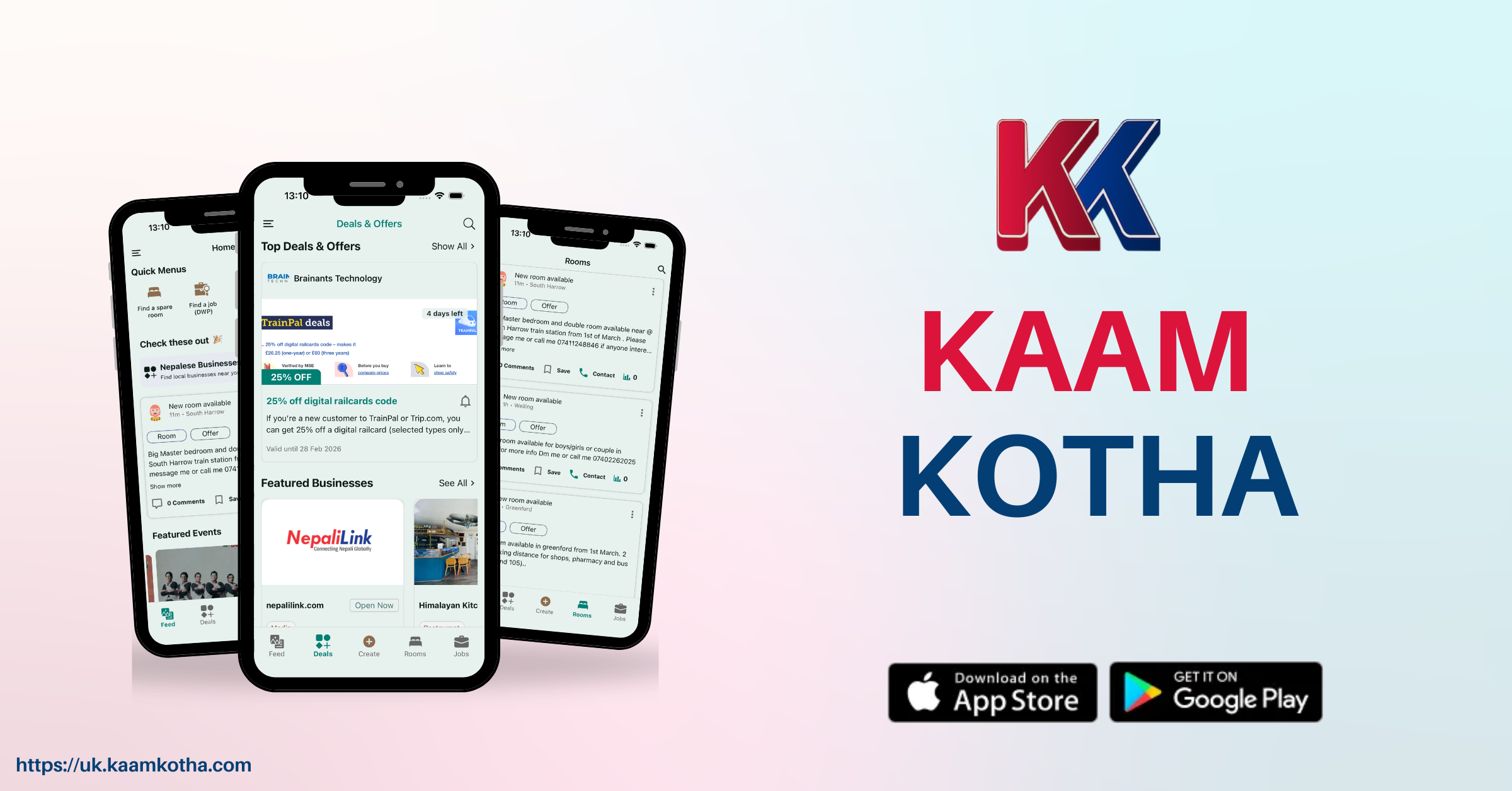 यूकेको नेपाली समुदायलाई अझ आधुनिक, व्यवस्थित र सुरक्षित बनाउने लक्ष्यका साथ ल्याइएको यो एप App Store र Play Store दुवैमा उपलब्ध छ। थप जानकारीका लागि काम कोठाको आधिकारिक वेबसाइट uk.kaamkotha.com मा जान सक्नुहुन्छ।