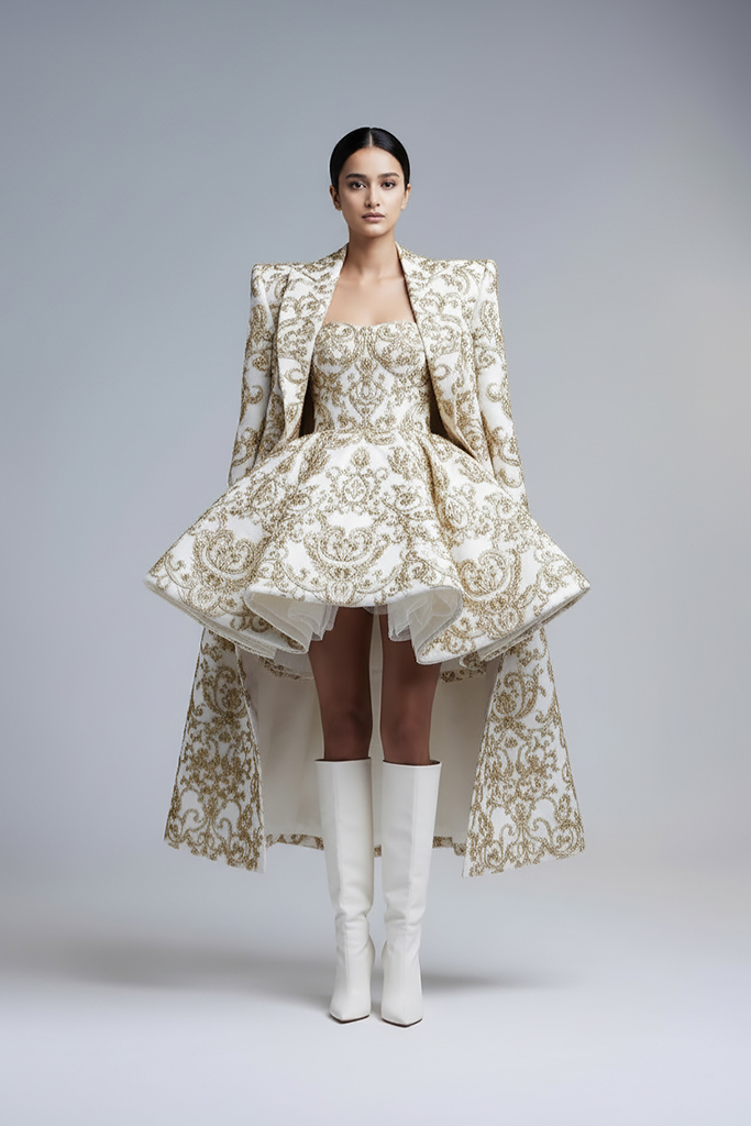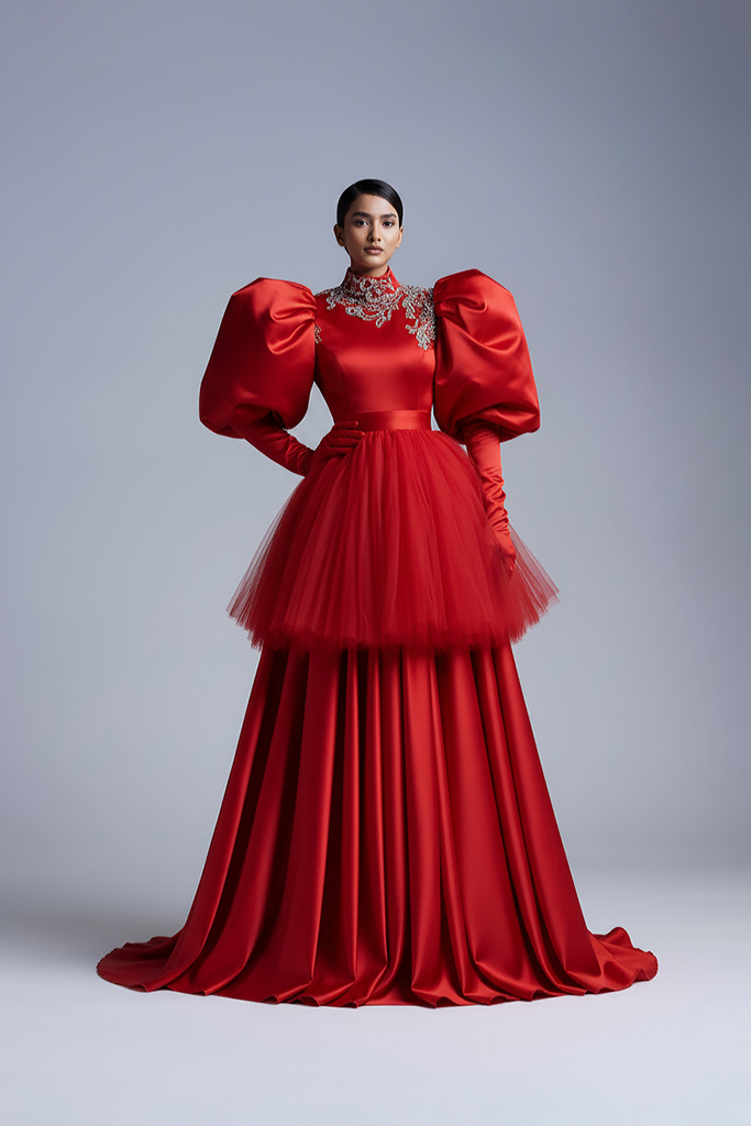 The collection features clean, sculptural shapes, including Shrestha’s signature peplum, in rich tones of Maroon Gold and Forest Green, balanced with Black, White, and Red. Each piece is designed to show that luxury fashion can be beautiful without creating unnecessary waste.