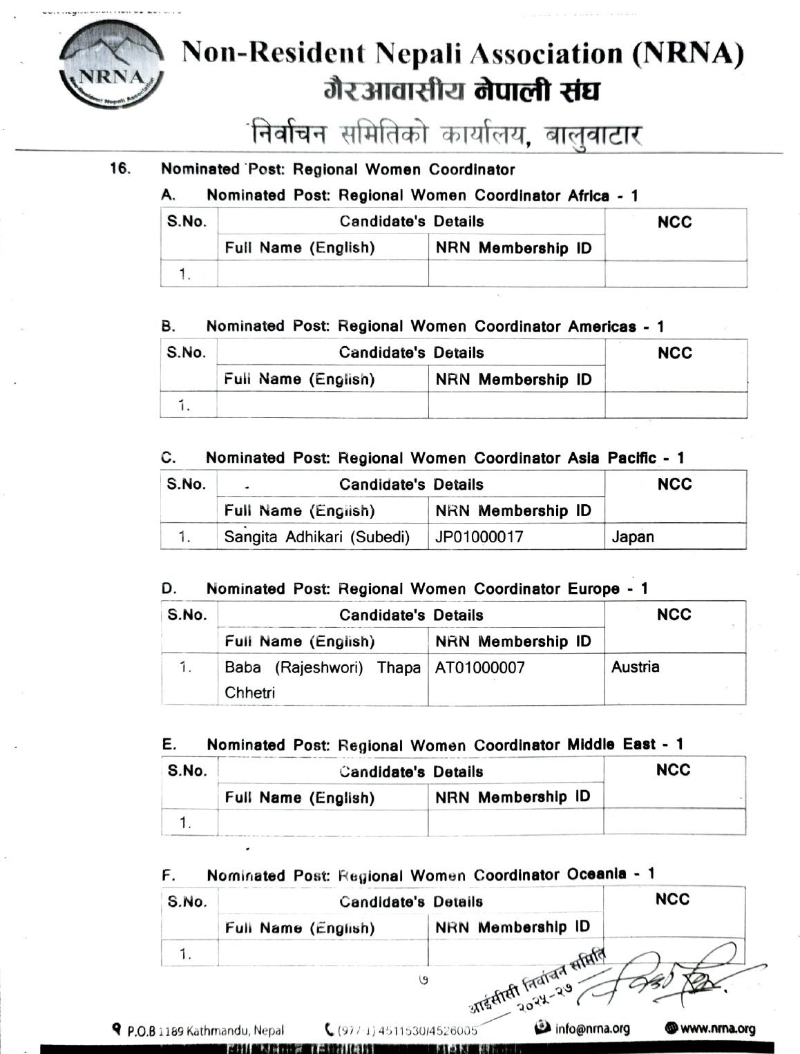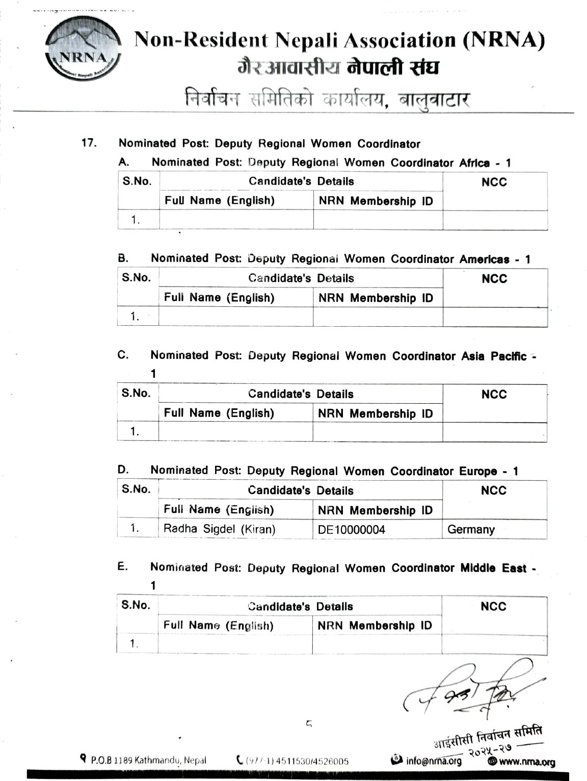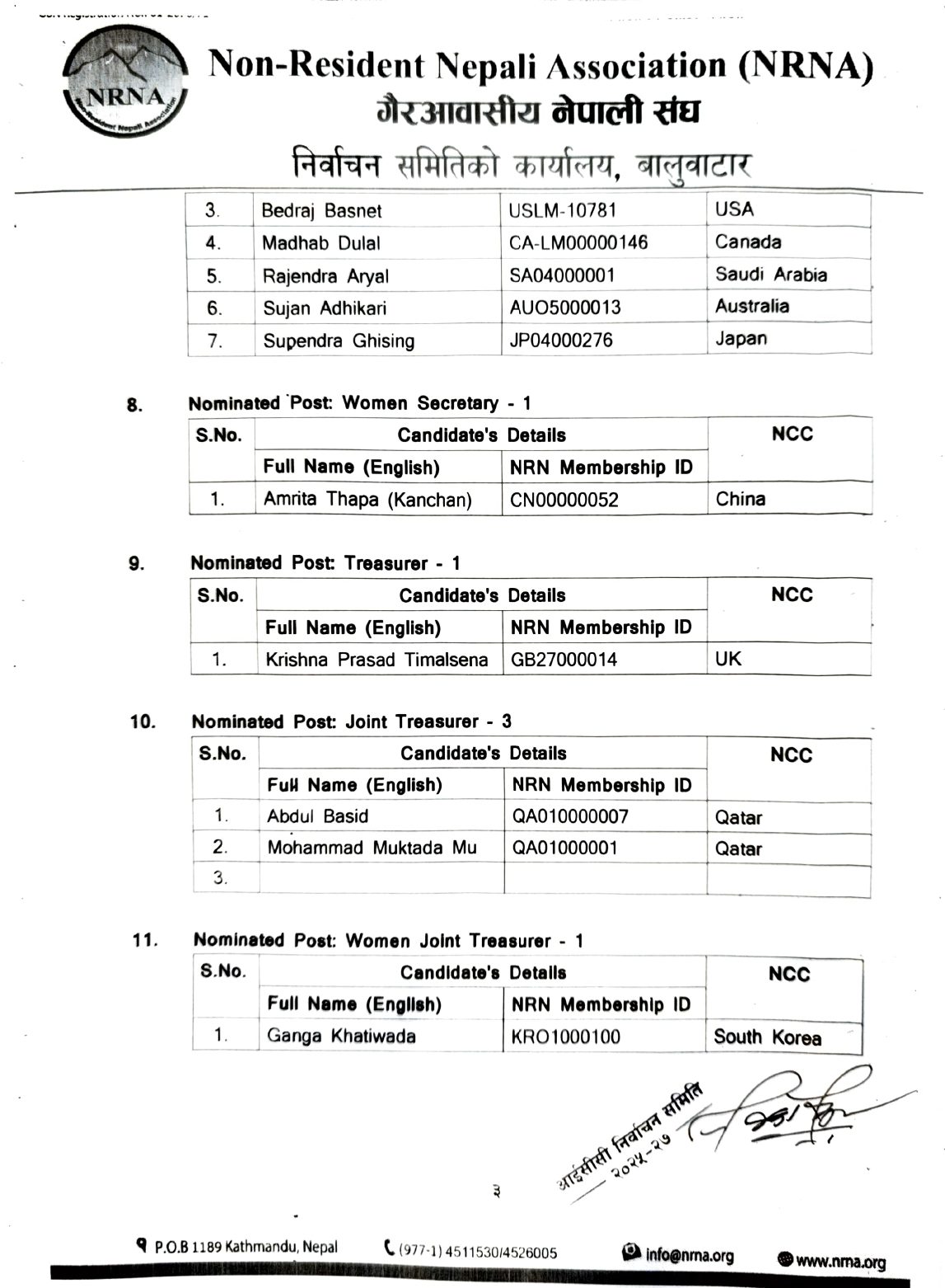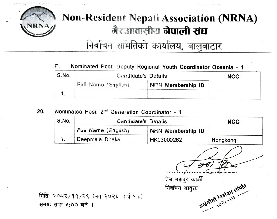 महिला उपाध्यक्षमा राधिका गुरुङ (टीका) को मात्र उम्मेदवारी परेपछि उनी निर्विरोध निर्वाचित भएकी छन् । कोषाध्यक्षमा समेत बेलायतका कृष्णप्रसाद तिमिल्सिनाको मात्र उम्मेदवारी परेपछि उनी पनि निर्विरोध भएका छन् ।