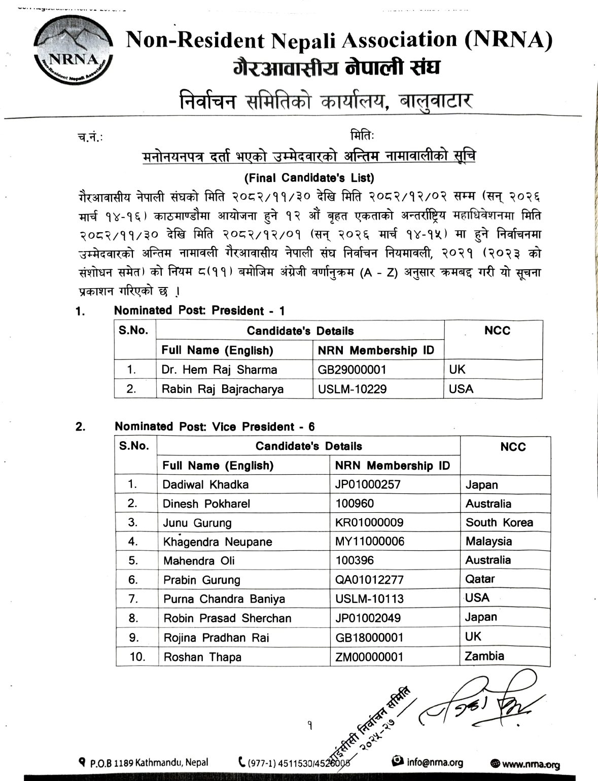 निर्वाचन समितिले मनोनयनपत्र दर्ता गरेका उम्मेदवारहरुको अन्तिम नामावली शुक्रबार प्रकाशित गरेको छ । अध्यक्ष पदका लागि डा. हेमराज शर्मा (यूके) र रविनराज बज्राचार्य (अमेरिका) बीच प्रतिष्पर्धा हुने भएको छ । रोविनप्रसाद शेरचन (जापान) ले शर्मालाई सघाउने भन्दै अध्यक्षबाट ब्याक भएर उपाध्यक्षमा नाम दर्ता गराएका छन् ।