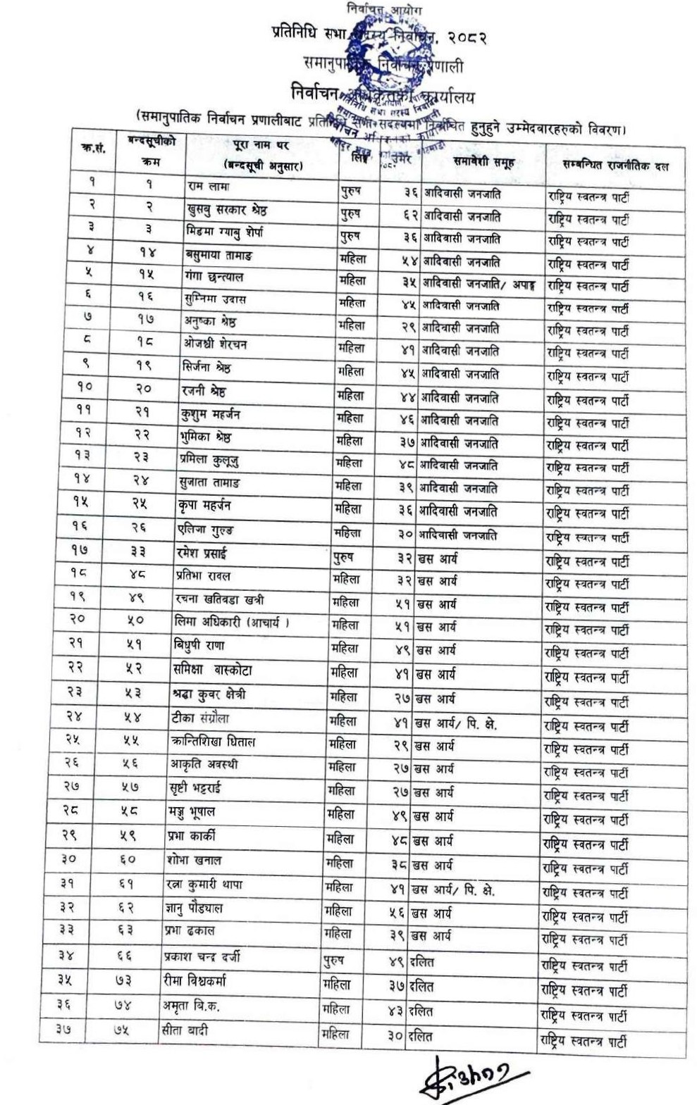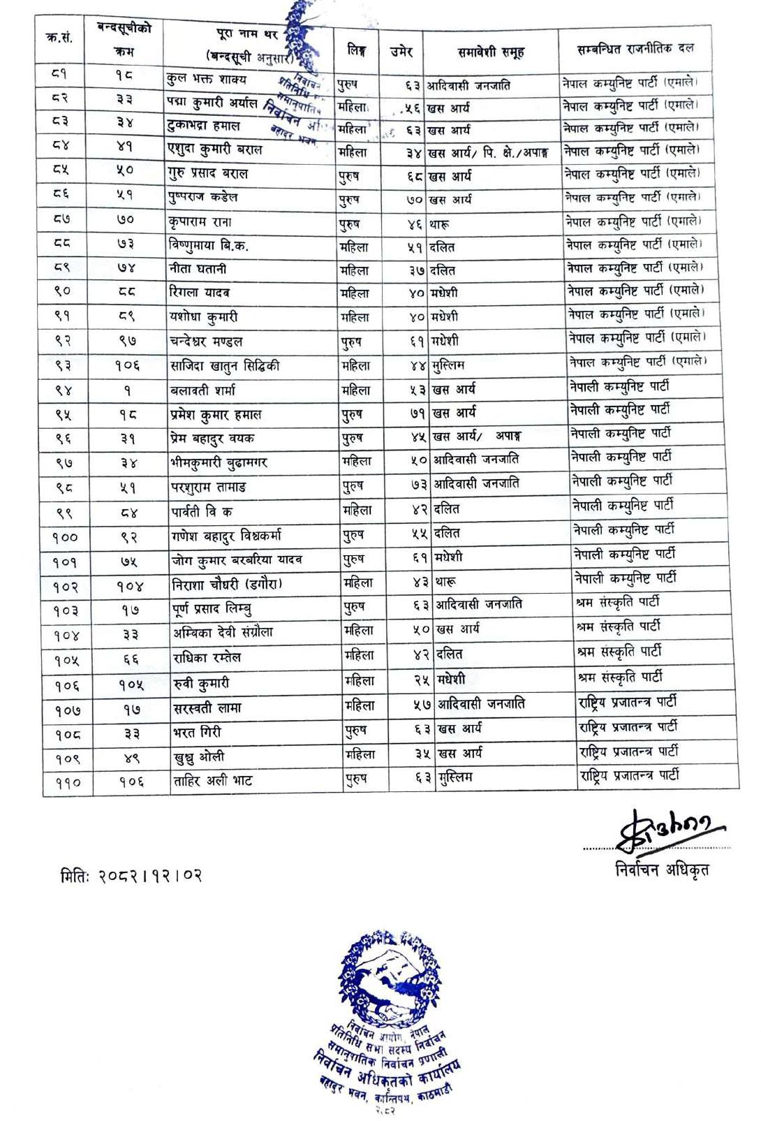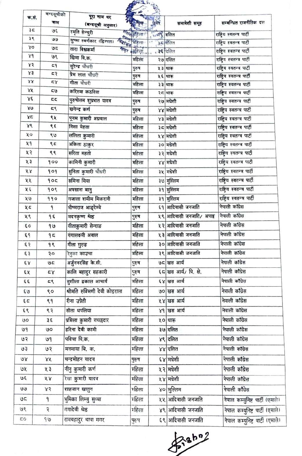समानुपातिकतर्फ राष्ट्रिय स्वतन्त्र पार्टीका ५७ जना, नेपाली कांग्रेसका २० जना, नेकपा एमालेका १६ जना, नेपाली कम्युनिष्ट पार्टीका ९ जना, श्रम संस्कृति पार्टीका र राष्ट्रिय प्रजातन्त्र पार्टीका ४/४ जना रहेका छन्।