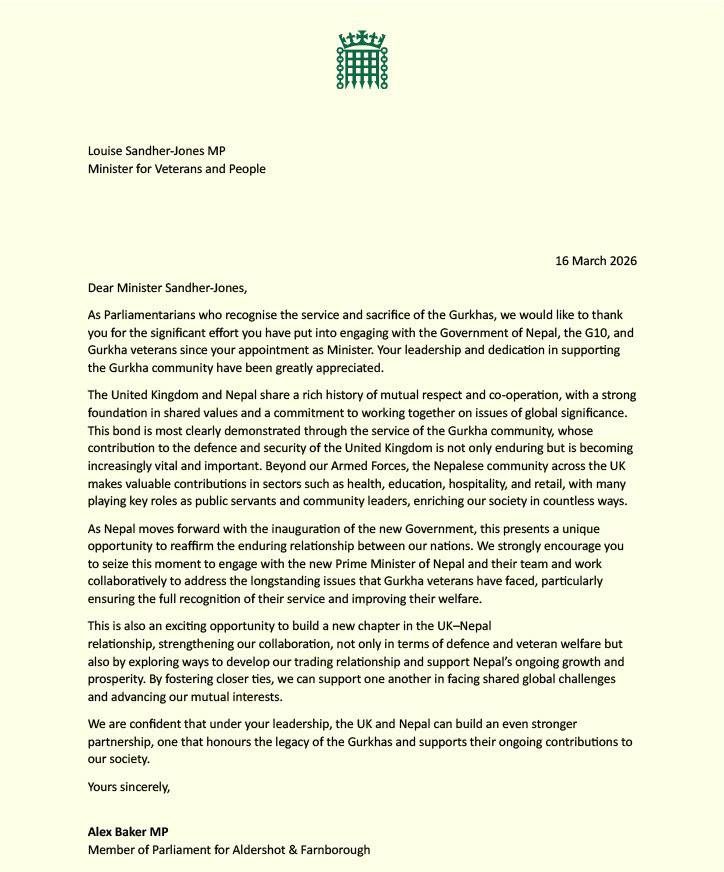 नेपाल नयाँ सरकार गठनसँगै अगाडि बढ्न लागिरहंदा अहिले दुई राष्ट्रहरूबीचको दिगो सम्बन्ध पुनः पुष्टि गर्ने एक अद्वितीय अवसर प्राप्त भएको उल्लेख गर्दै सांसदहरुले पत्रमा मन्त्री जोन्सलाई नेपालका नयाँ प्रधानमन्त्री र उनको टिमसँग निकट रहन, भूतपूर्व गोर्खा सैनिकहरूले लामो समयदेखि राख्दै आएका मुद्दा सम्बोधन गर्न, विशेष गरी उनीहरूको सेवाको उचित कदर एवं थप कल्याणका लागि सहकार्यमा यो क्षण सदुपयोग गर्न सुझाएका छन् ।