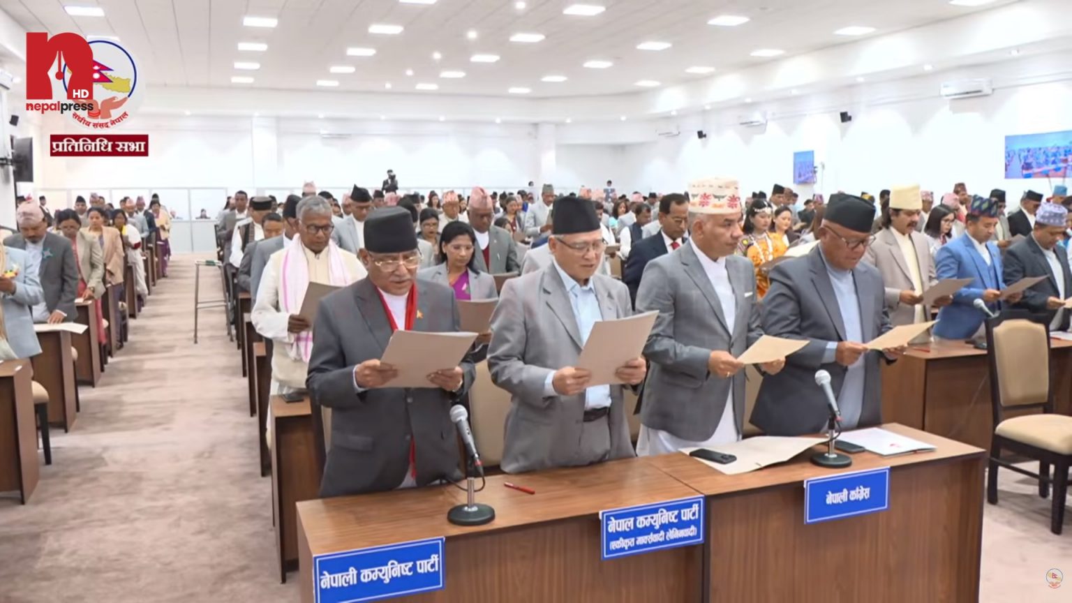 संसद्का ज्येष्ठ सदस्य अर्जुननरसिंह केसीले प्रतिनिधिसभाका २७४ जना सांसदलाई शपथ गराएका हुन् । तीमध्ये ४७ जना सांसदहरूले १७ मातृभाषामा शपथ लिएका छन्।उनीहरु आ–आफ्नो  भेषभूषामा सजिएर आएका थिए ।  प्रतिनिधिसभाको मुख्य हल निर्माण नभएका कारण बहुउद्देश्यीय हलमा शपथको कार्यक्रम राखिएको संसद सचिवालयले जनाएको छ ।