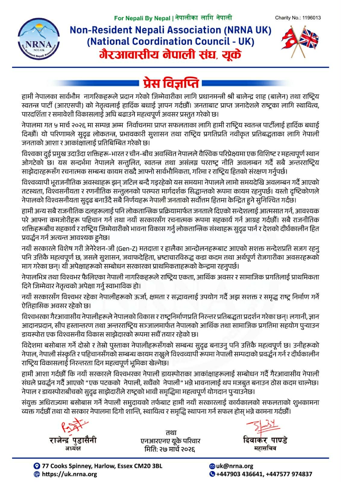 एनआरएनए यूकेका अध्यक्ष राजेन्द्र पुडासैनी र महासचिव दिवाकर पाण्डेद्वारा संयुक्त रूपमा जारी गरिएको वक्तव्यमा नेपालभित्र तथा विश्वभर रहेका नेपालीहरूले जिम्मेवार नेतृत्वमार्फत राष्ट्रिय एकता, आर्थिक अवसर र सामाजिक प्रगतिको अपेक्षा गरेको उल्लेख छ।