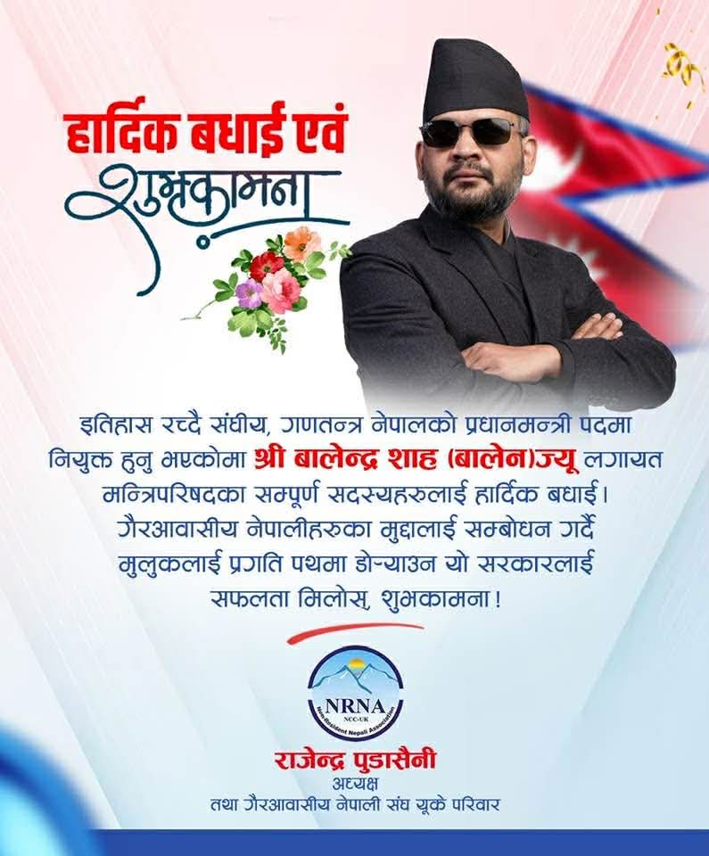 नेपालका नवनियुक्त प्रधानमन्त्री बालेन्द्र शाह (बालेन) तथा राष्ट्रिय स्वतन्त्र पार्टी नेतृत्वमा गठित मन्त्रिपरिषदलाई हार्दिक बधाई दिंदै एनआरएनए यूकेले यो जनादेशले देशमा स्थायित्व, पारदर्शिता र समावेशी विकास अघि बढाउने महत्वपूर्ण अवसर प्रदान गरेको उल्लेख गरेको छ।