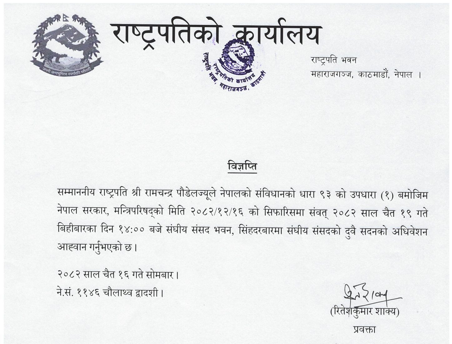 उनले नेपालको संविधानको धारा ९३ को उपधारा (१) बमोजिम नेपाल सरकार, मन्त्रिपरिषद् बैठकको सिफारिसअनुसार यही चैत १९ गते बिहीबार दिउँसो २ः०० बजे अधिवेशन आह्वान गरेको राष्ट्रपतिको कार्यालयका प्रवक्ता रितेशकुमार शाक्यले जानकारी दिए ।
