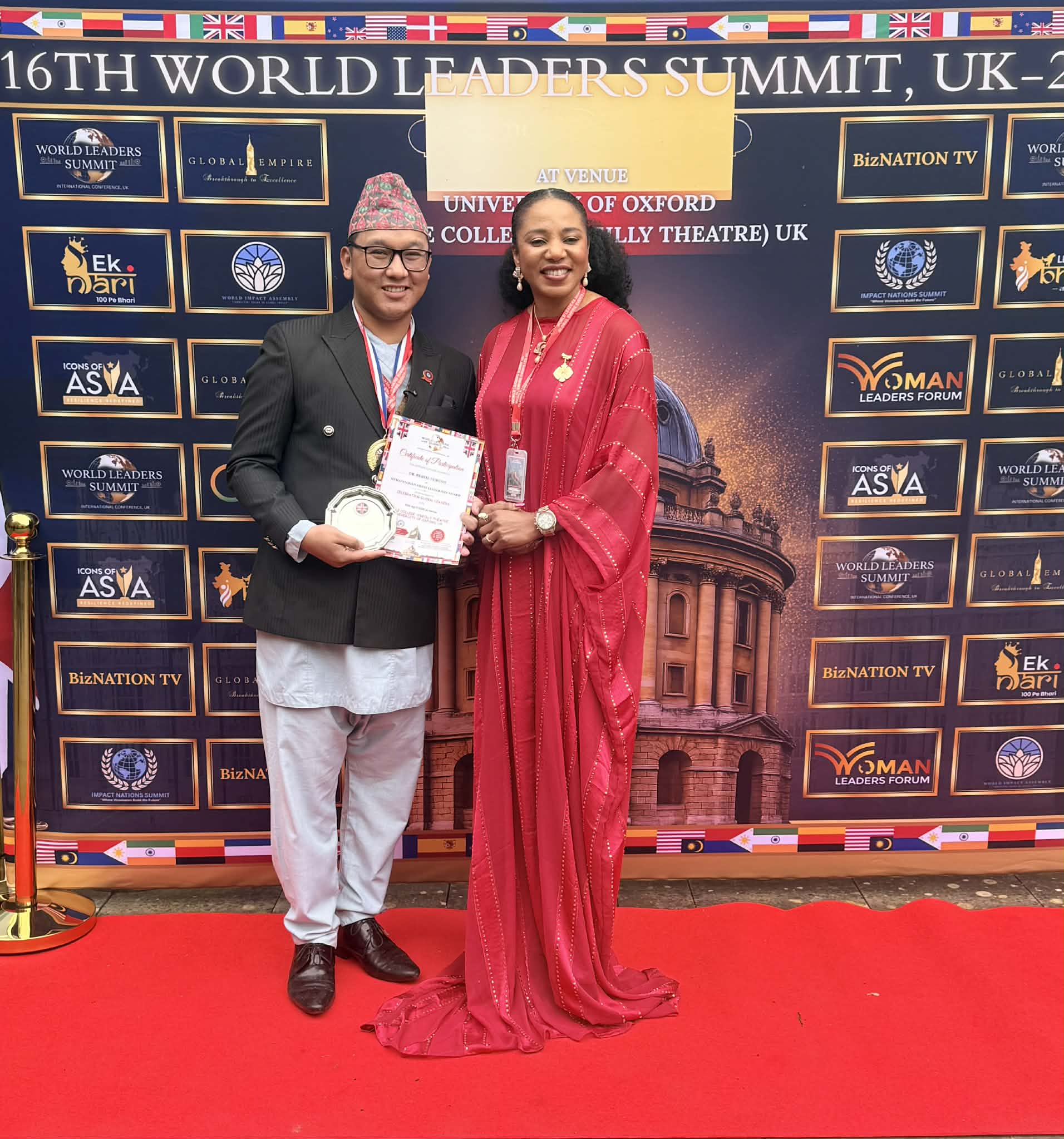 शुक्रबार बेलायतको अक्सफोर्डस्थित अक्सफोर्ड युनिभर्सिटी, केबल कलेजको ओराइली थिएटरमा सम्पन्न १६ औं ‘वर्ल्ड लिडर्स समिट’ मा उनले ‘ह्युमानिटेरियन भिजन लिडर अवार्ड’ प्राप्त गरेका हुन्।