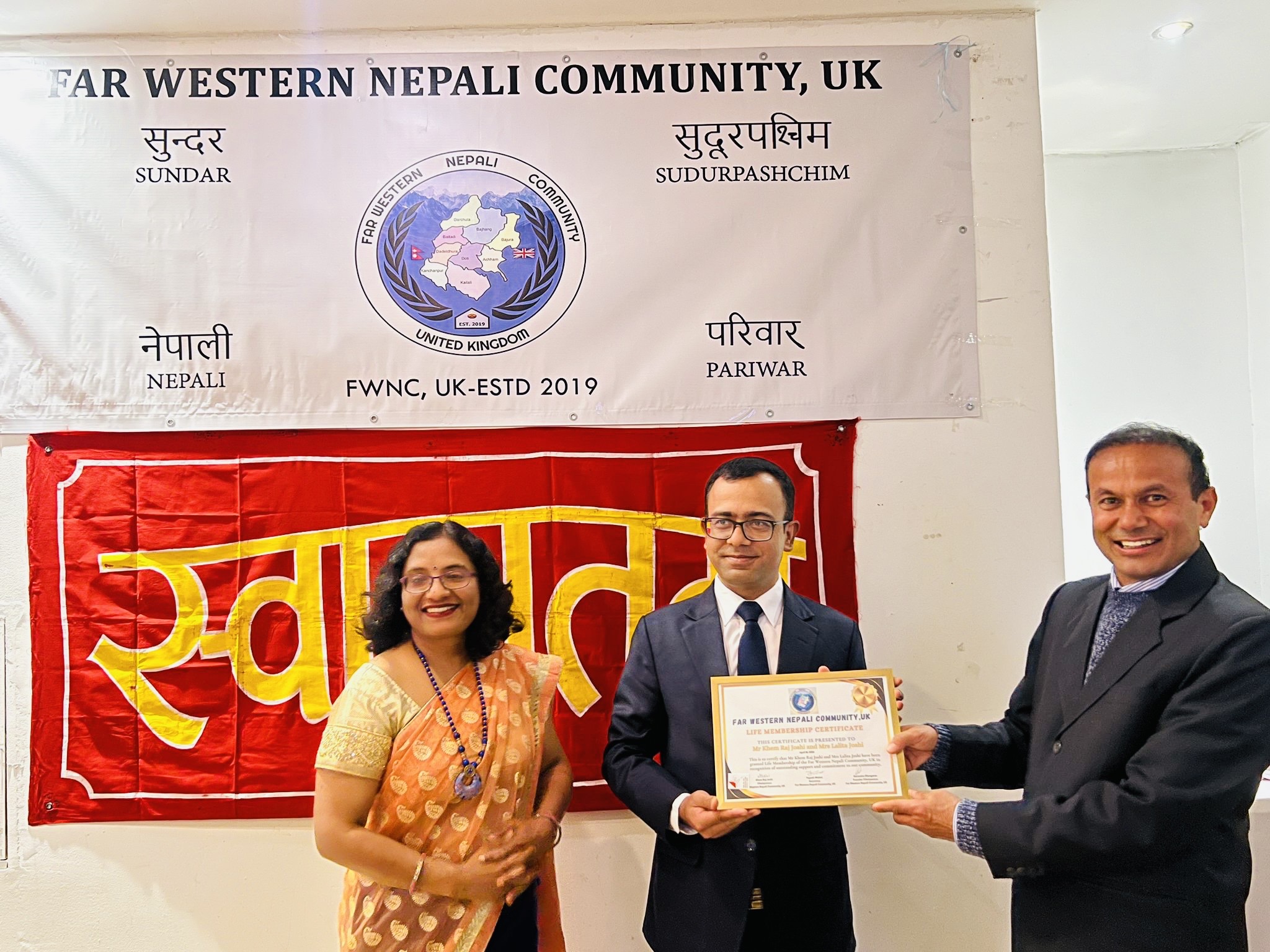 यसअघि सुन्दर सुदूर पश्चिम नेपाली समाज यूके का नव निर्वाचित कार्यसमितिका पदाधिकारी तथा आजीवन सदस्यहरुलाई कार्यवाहक राजदूत विपिन दुवाडीले प्रमाण पत्र हस्तान्तरण गरेका थिए ।