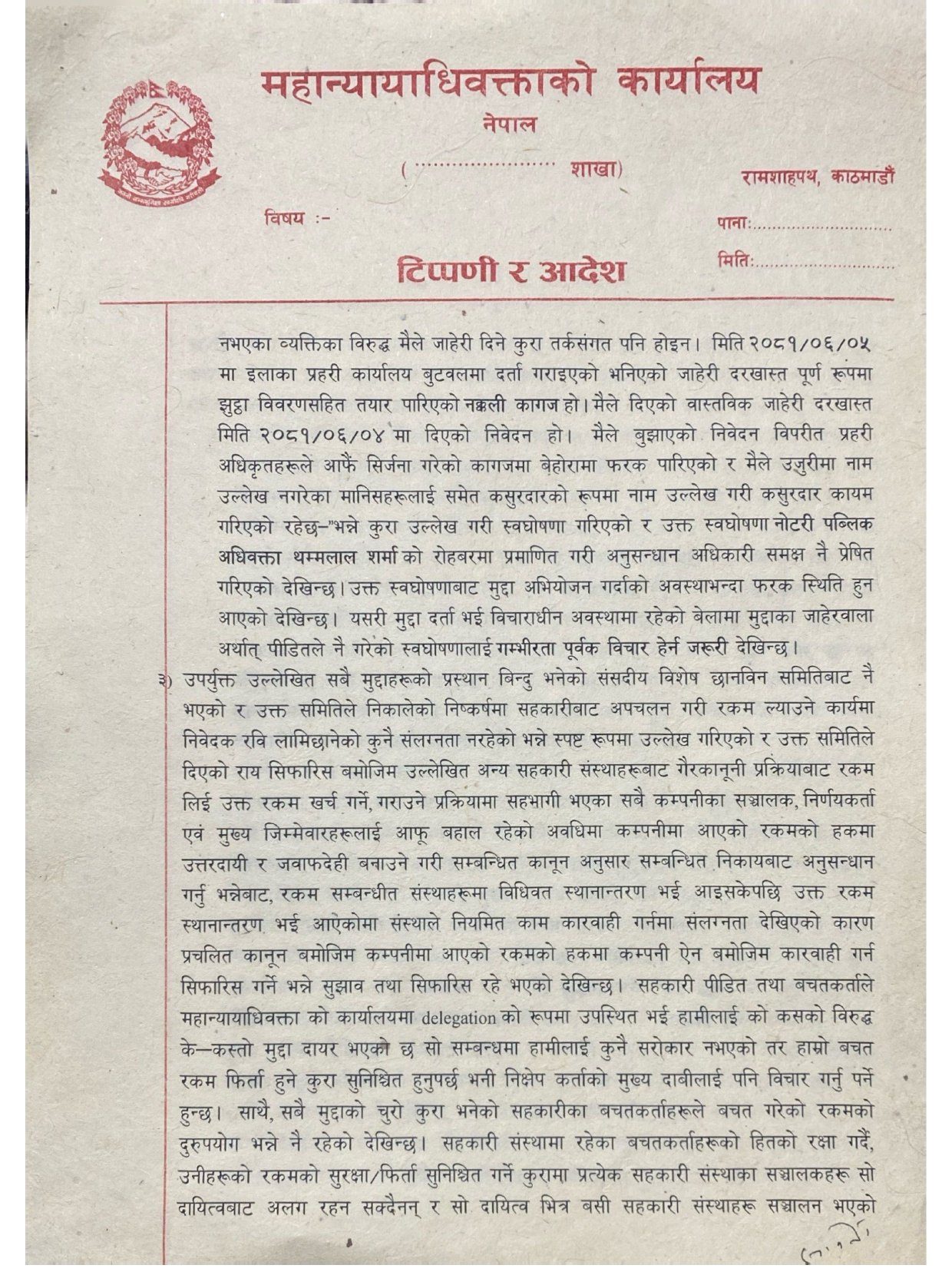 आदेशमा भनिएको छ– सहकारीबाट गैरकानुनी रूपमा रकम निकाल्ने र गोर्खा मिडियामा पठाउने कार्यमा संलग्न रहेका अन्य सञ्चालक र निर्णयकर्ताहरू नै मुख्य जिम्मेवार हुन् । लामिछानेको हकमा कम्पनीमा आएको रकम खर्च गर्ने भूमिका मात्र देखिएकाले उनलाई संगठित अपराधको घेरामा राख्नुभन्दा सहकारी ठगीको दायरामा मात्र राख्नु उपयुक्त हुने निष्कर्ष निकालिएको छ ।