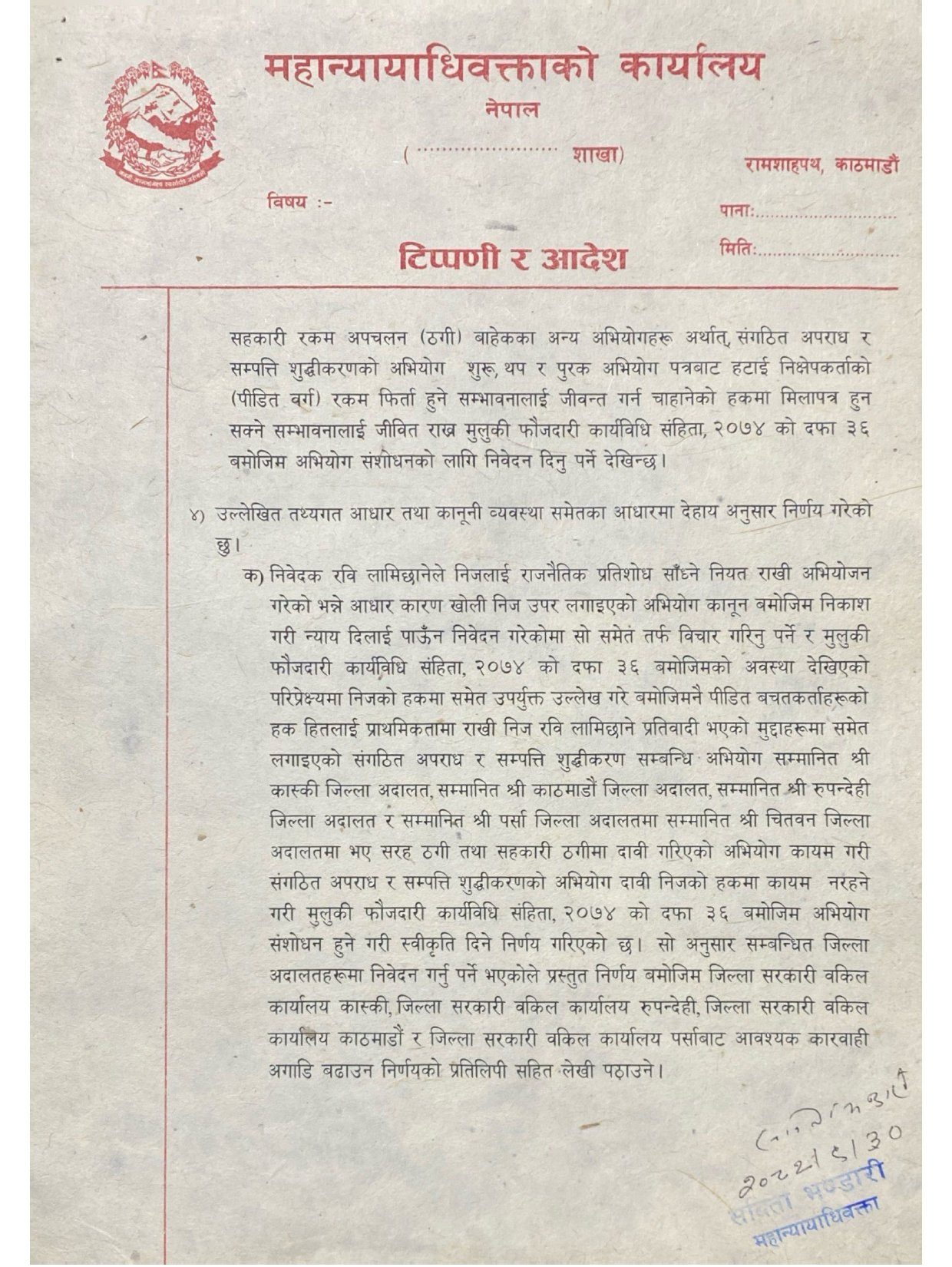 काठमाडौँ । महान्यायाधिवक्ताको कार्यालयले पूर्वगृहमन्त्री तथा राष्ट्रिय स्वतन्त्र पार्टी (रास्वपा) का सभापति रवि लामिछानेविरुद्ध विभिन्न जिल्ला अदालतमा विचाराधीन संगठित अपराध र सम्पत्ति शुद्धीकरणसम्बन्धी अभियोग फिर्ता लिन सम्बन्धित सरकारी वकिल कार्यालयहरूलाई अभियोगपत्र संशोधनको स्वीकृति दिएको छ।